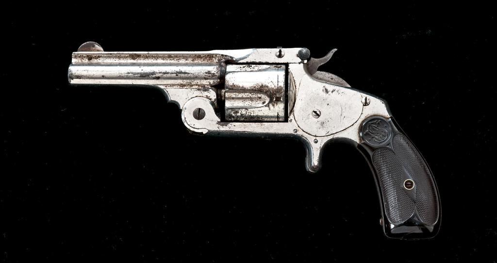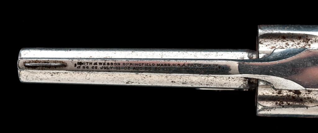 Smith & Wesson .38 Single Action 2nd Model Revolver, #81529, .38 S&W cal., 3.25" barrel with full rib, pinned blade front and fixed rear sights, 5-shot cylinder, nickel finish, checkered hard rubber S&W embossed two-piece grips. Includes an NRA letter from Jim Supica and Roy Jinks confirming the features and date of mfg. as 1881. Revolver is in very good overall condition retaining approx. 70%-75% flaking factory nickel finish, with light surface rust and erosion evident, more pronounced on the cylinder. Hammer and trigger show muted case colors and screw heads are clean throughout. S&W grips are good with small cracks at the base of each panel but a good fit. Action is good and lockup remains tight; bore is fair with clearly defined rifling. Mfg'd from 1877 to 1891, with just over 108,000 of the 2nd Model produced. Considered a refinement of the Baby Russian 1st Model. Est.: $700-$900. (Antique)