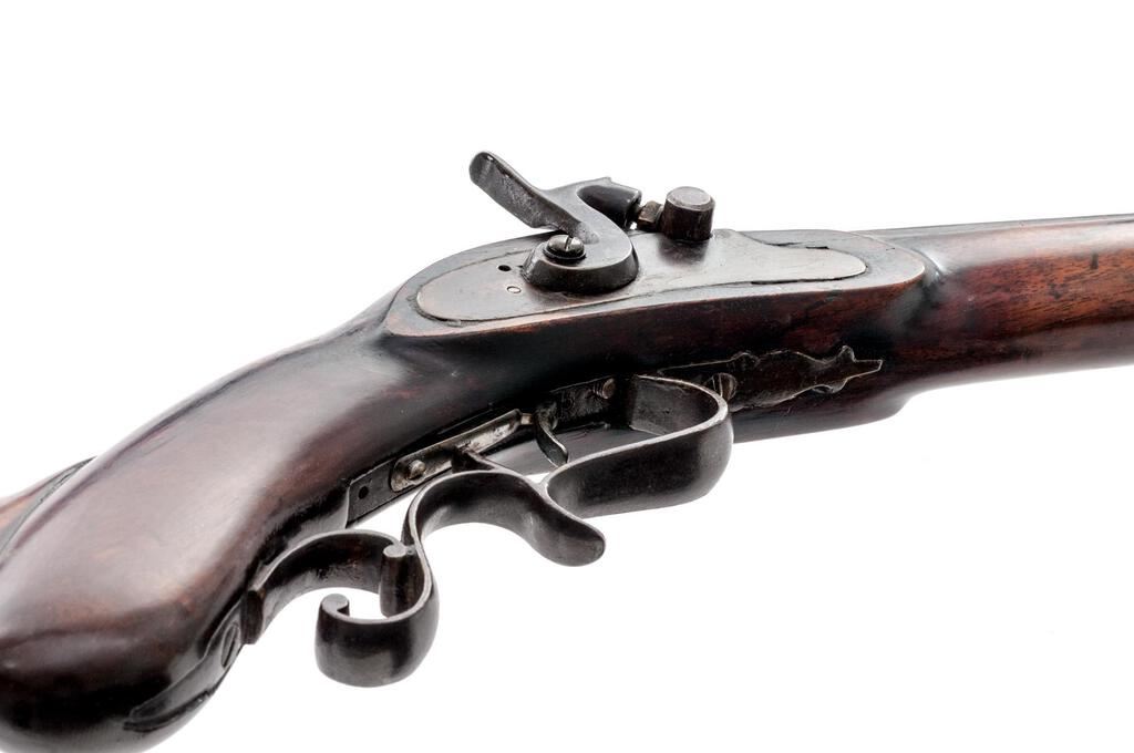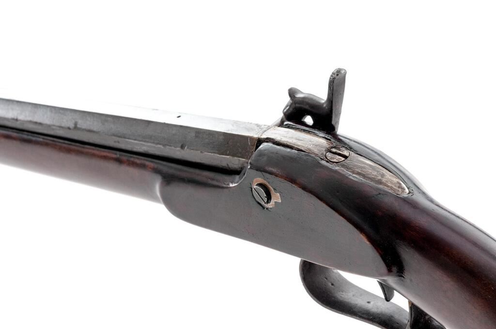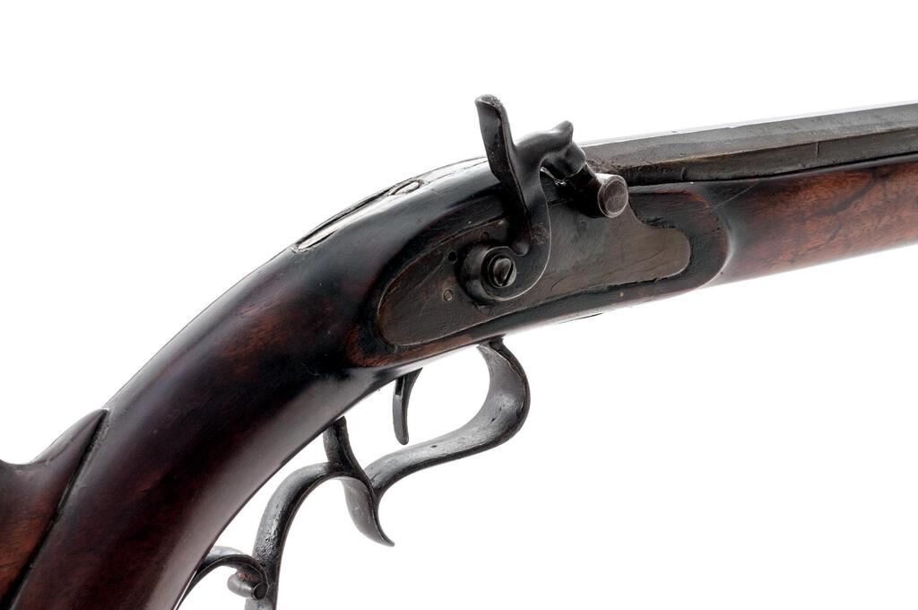 Antique Percussion Sporting Rifle, Perhaps American Showing European Influence but Unmarked, NVSN, .42 cal., key-retained 34" octagonal barrel has dovetailed buckhorn sights, 2 brass pipes on full-length lower rib retaining the brass-tipped hickory ramrod; unmarked flat lockplate has sporting hammer, "drum" style nipple bolster; walnut halfstock has carved pistol-grip, fancy scrolled trigger guard, crescent buttplate, pewter nosecap. Condition is good, the barrel showing much reblued finish over light oxidation, else smooth gray gunmetal. Stock is sound and smooth with later varnish, lovely grain and color. Action does not hold cock, smoothbore appears clean. Est.: $500-$800. (Antique)