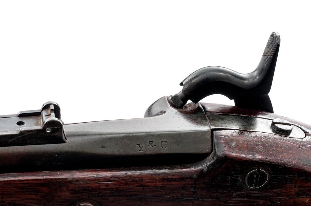 Springfield Model 1861 Single-Shot Percussion Shortened Rifle, NVSN, .58 cal., 28" round barrel with standard sights, marked "Y&C" at left breech; 1863-dated Springfield lockplate and hardware are correct Civil War M-1861 rifle pieces, as is the oil-finished 2-band walnut fullstock. Steel tulip-head ramrod. As with many surplus military arms at war's end, this rifle was likely purchased at a government auction by an arms dealer?perhaps "Y&C" in this case?shortened and lightened, then re-sold for civilian sporting use. Condition is good to very good as configured, having been refinished in blue some time ago while retaining good edges and markings. Stock is sound showing 2 vacant screw holes at top of wrist (probably for a tang sight), light marks and two inspectors' cartouches (incl. "ESA") opposite the lock. Action is crisp, bore shows cleaned frosting and good rifling. Est.: $400-$600. (Antique)