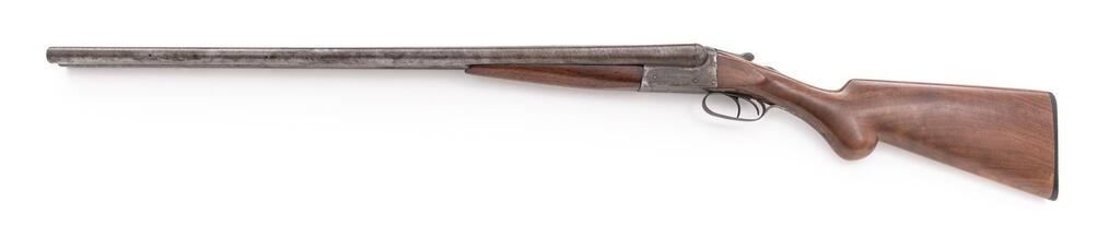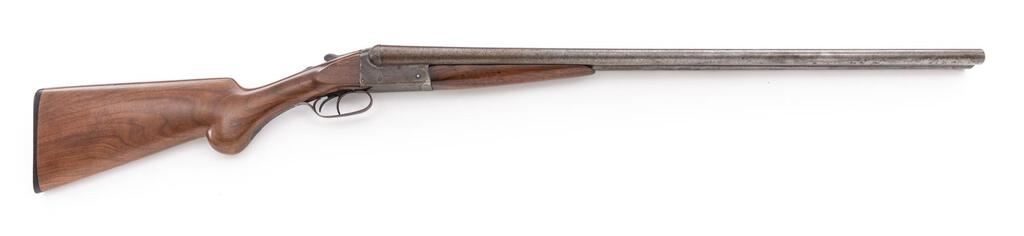 Remington Model 1900 KED Side-by-Side Hammerless Shotgun, #310543. 12 ga. 30" solid rib Damascus barrels have 2-5/8" chambers and are choked IM/IM. The boxlock action features lockup via a single underlug plus top extension, double triggers, automatic safety, and auto ejectors; receiver is unengraved except for maker's stamp. The splinter forend and Prince of Wales round-knob buttstock are oil-finished red straight-grain walnut, uncheckered, with a Remington plastic buttplate. Mfg'd approx. 1904. Condition is good to very good, showing much field use. There is approx. 50%-60% finish remaining on the barrels, only dark patina to the receiver, and little wear at all to the wood, which appear to be replacements. Action is a bit sticky but closes tight and functions correctly; bores are lightly scored but not pitted. Est.: $500-$700. (C&R)