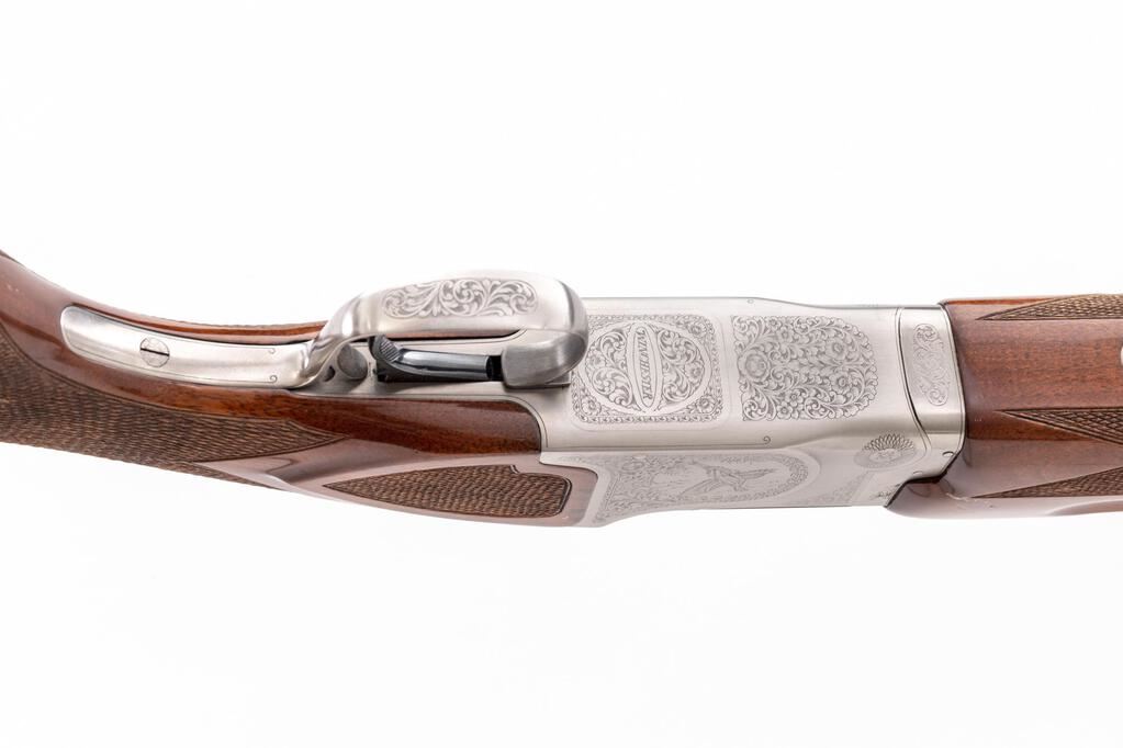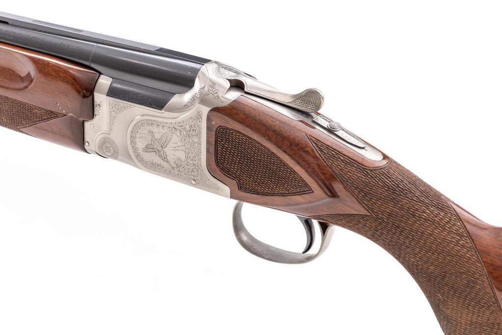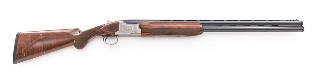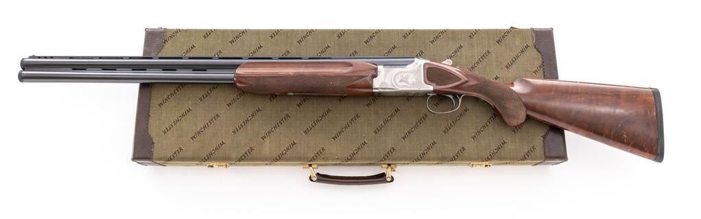 Winchester Model 101 Pigeon Grade XTR Lightweight Over/Under Shotgun, #PK493545E. 12 ga. 27" vent rib barrels have target beads, 3" chambers, and are fitted for the early Winchokes that protrude from the muzzles (six included, Skt-XF, with Winchester wooden handle spanner wrench). The boxlock action features a single selective mechanical trigger, non-auto safety, and auto ejectors. The receiver, trigger guard, forend iron, top tang and operating lever are coin-finished, with engraved game birds surrounded by floral patterns. The finger-groove forend and round pistol grip buttstock are of high-gloss "C" Grade European walnut, with extensive checkering and original Winchester butt pad. Stock measurements are 14-1/4"x1-1/2"x2-1/8". Gun is contained in the original green canvas Winchester hard case, with multi-lingual instructions. Mfg'd mid-1980's. Condition is good to very good retaining approx. 70% finish with average wear to action, which locks tight and functions correctly. Wood has numerous scratches and mars that detract from appearance. Bores are bright. Est.: $1,000-$1,200. (Modern)
