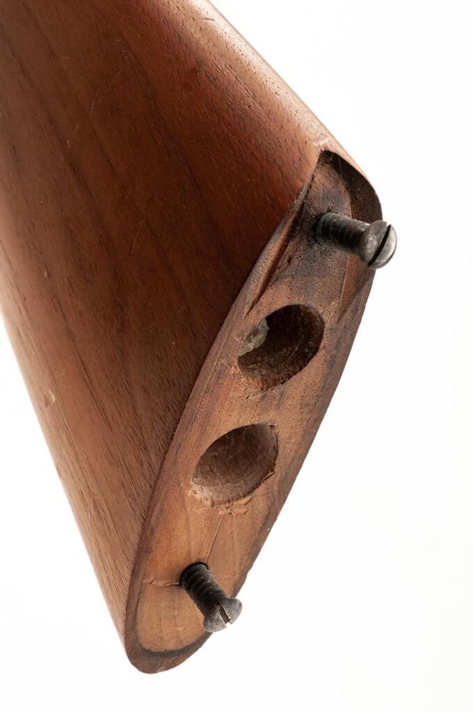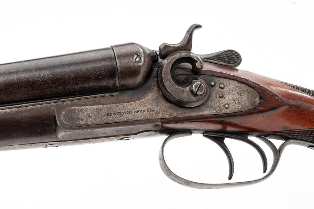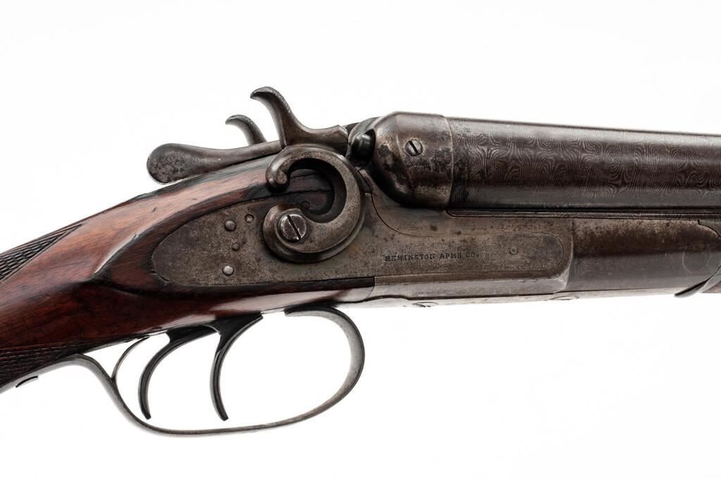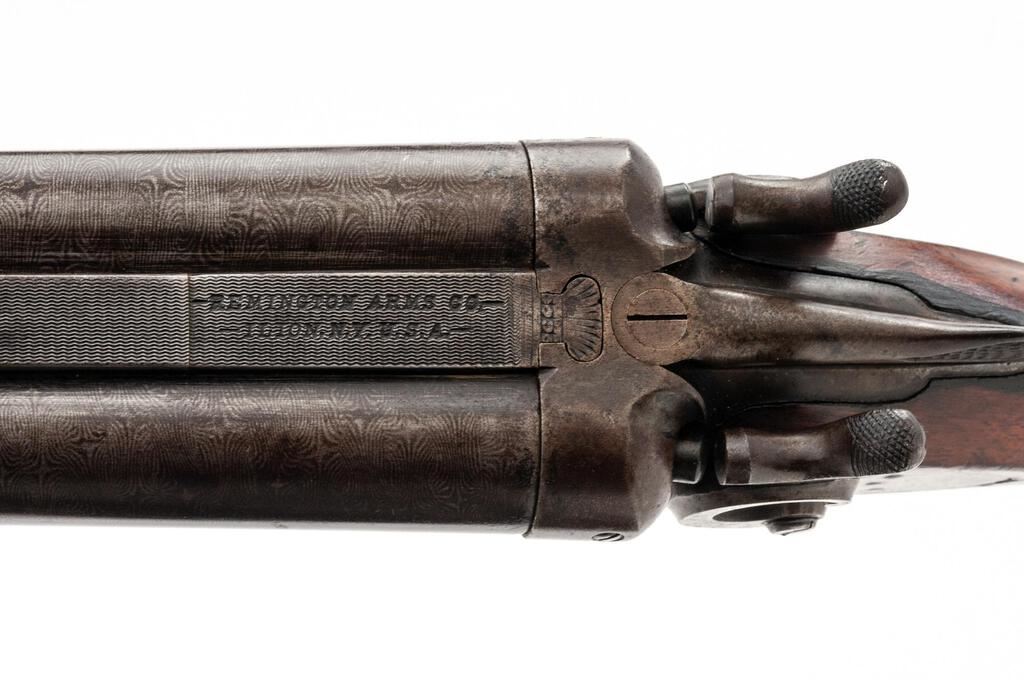 Remington Model 1889 Grade 3 Hammer-Type Side-by-Side Shotgun, #224323. 12 ga. 32" solid rib Damascus barrels have 2-3/4" chambers and are choked IM/IM. The 1889 action features lockup via dual underlugs plus doll's head rib extension, dual hammers and triggers, and simple extractors. The lockplates are unengraved except for the maker's stamp. The splinter forend and Prince of Wales round-knob pistol grip buttstock are oil-finished walnut and feature an ebony forend tip and good coverage of checkering; buttplate is missing. Mfg'd approx. 1902. Condition is good, with wood either refinished or replaced. Action closes tight but the action lever has a broken spring. Locks, triggers and hammers function correctly, as does the extractor. Approx. 50% faded Damascus finish remains, receiver has gone to a dull patina; bores are pitted. A good candidate for a restoration. Est.: $400-$500. (C&R)