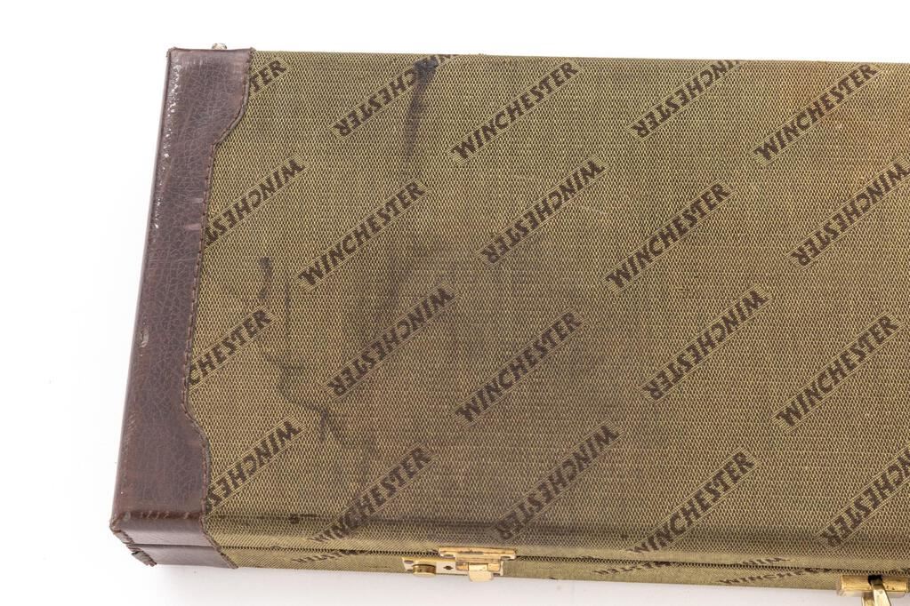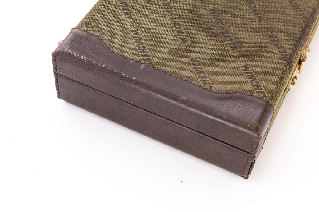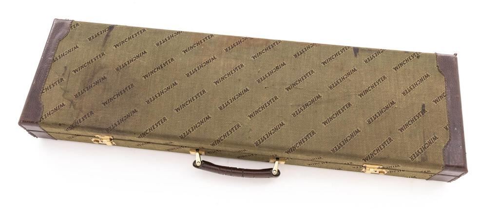 Factory Winchester Single Shotgun Case, for SxS shotgun, size indicates it is for a 20 ga. or smaller gun. Will accommodate up to a 28'' barrel length. Condition is good, both inside and out. Exterior shows some staining with loss of fabric on the bottom of the case and a small amount of missing leather on 5 of the 8 corners, with scuffs in other areas. Interior shows minor staining and a small tear on the divider. Handle is secure but has multiple cracks in the leather. Includes one key. Est.: $150-$250.