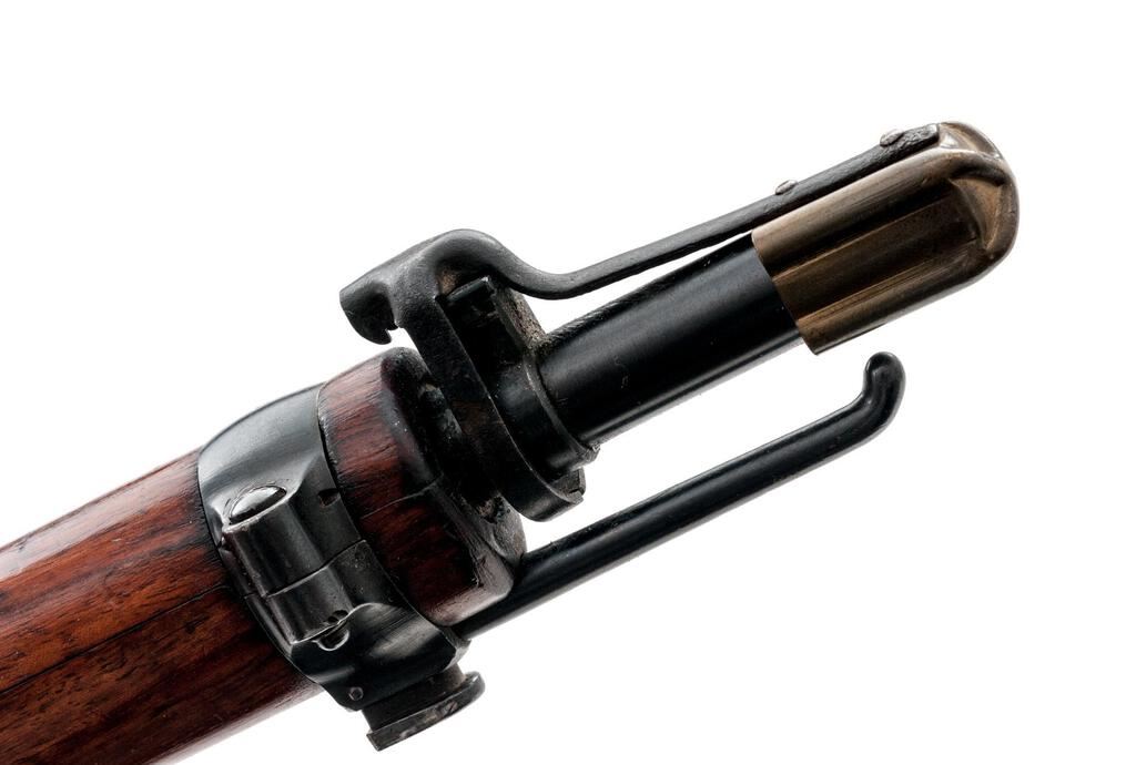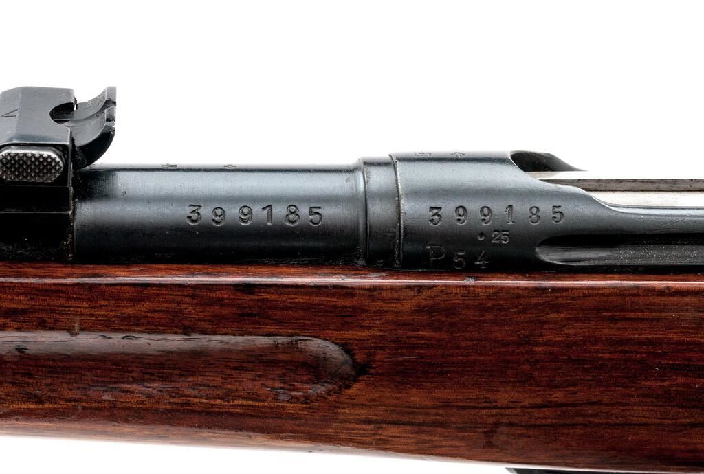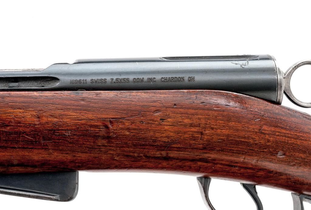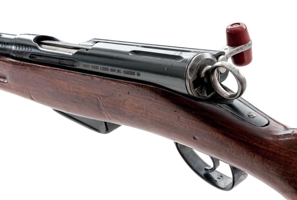 Swiss Model 1911 Schmidt-Rubin Straight-Pull Rifle, 7.5x55mm, #1G9611, 30.7" barrel, blued finish, hardwood stock set, blade front sight and adjustable tangent rear sight. A Swiss cross marked brass muzzle cover is fitted. Marked on top of receiver ring with Swiss cross and a stamped "P54" on the left side; a Swiss cross is also stamped on right side of buttstock. Matching numbers except rear sight assembly. Magazine has been re-numbered to match. Condition overall is very good with the metal retaining over 85% finish. The red Bakelite operating handling is close to excellent with a couple of light handling marks. Wood has had varnish applied, now darkened and showing an area of marring and mostly light handling marks. Action operates smoothly, bright bore is excellent with sharp well-defined rifling. Import engraved on left side of receiver. Est.: $300-$500. (C&R)