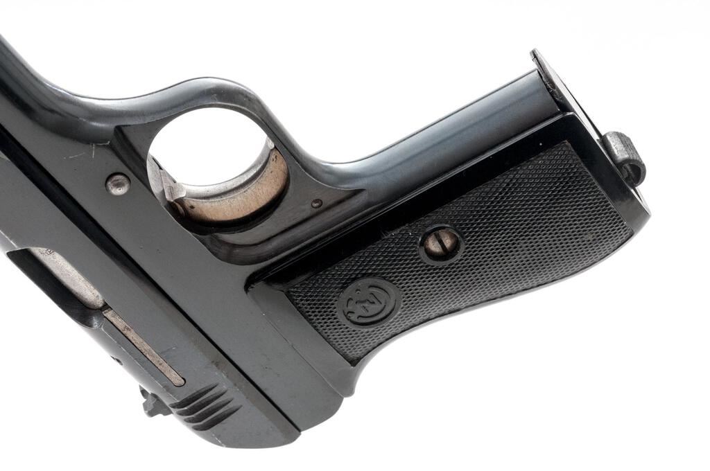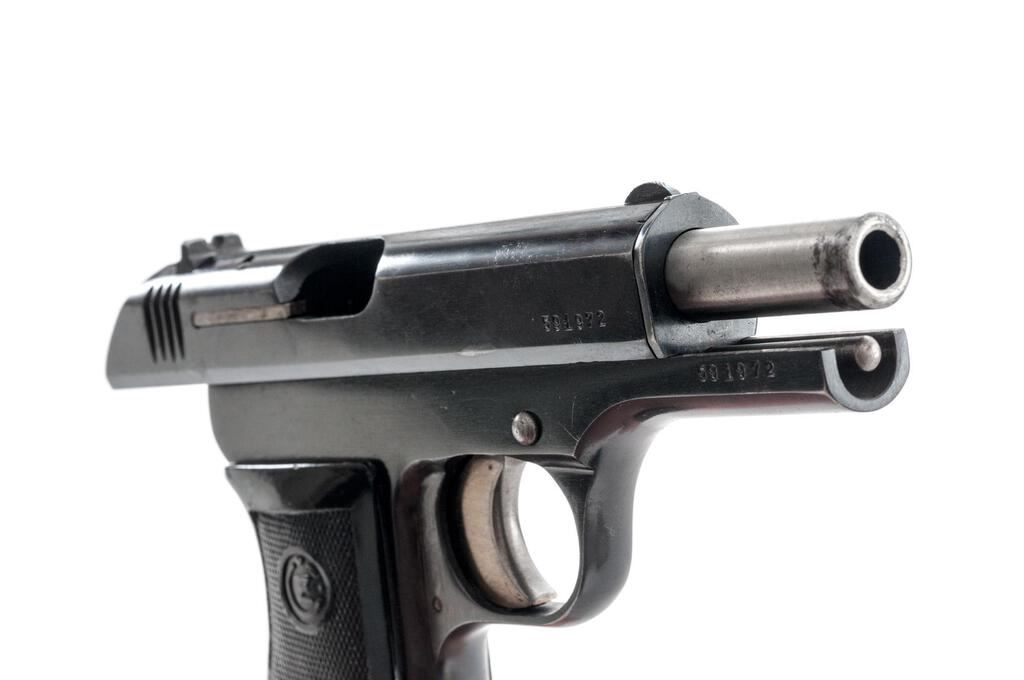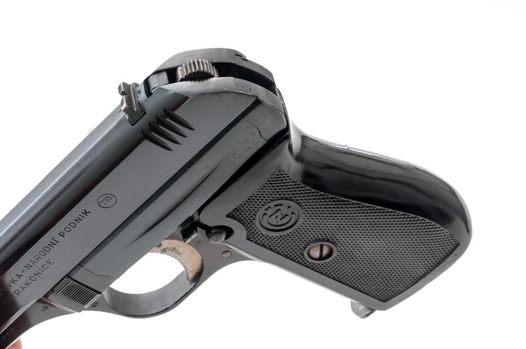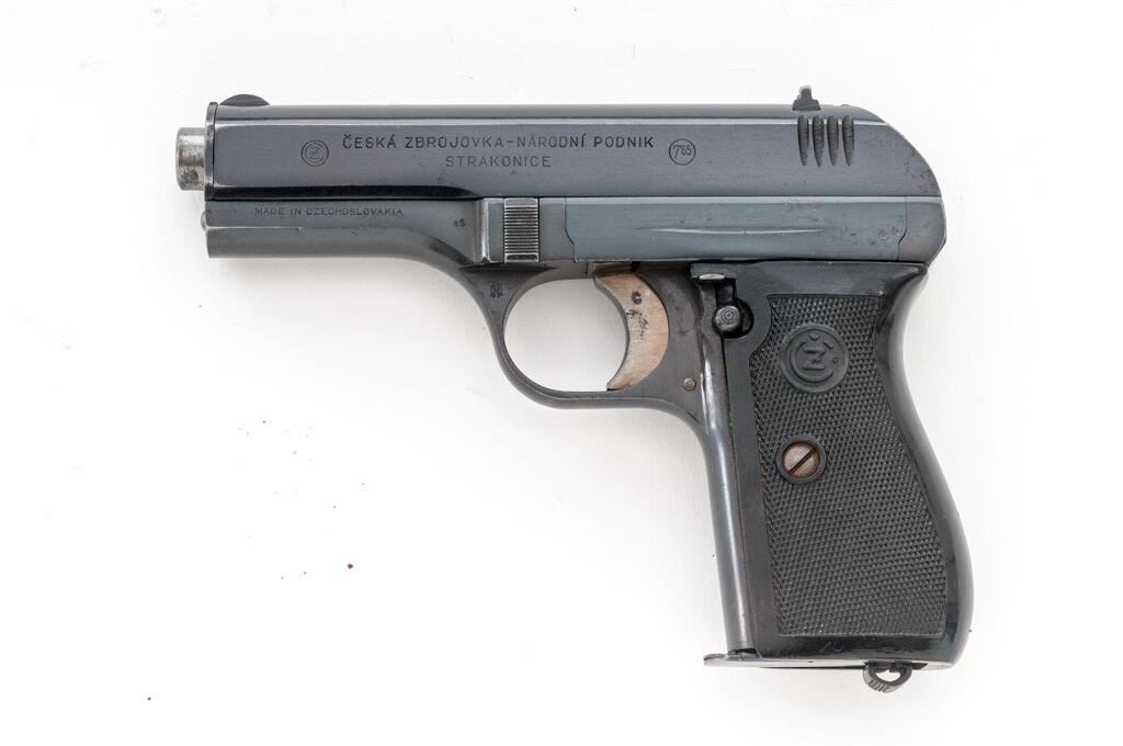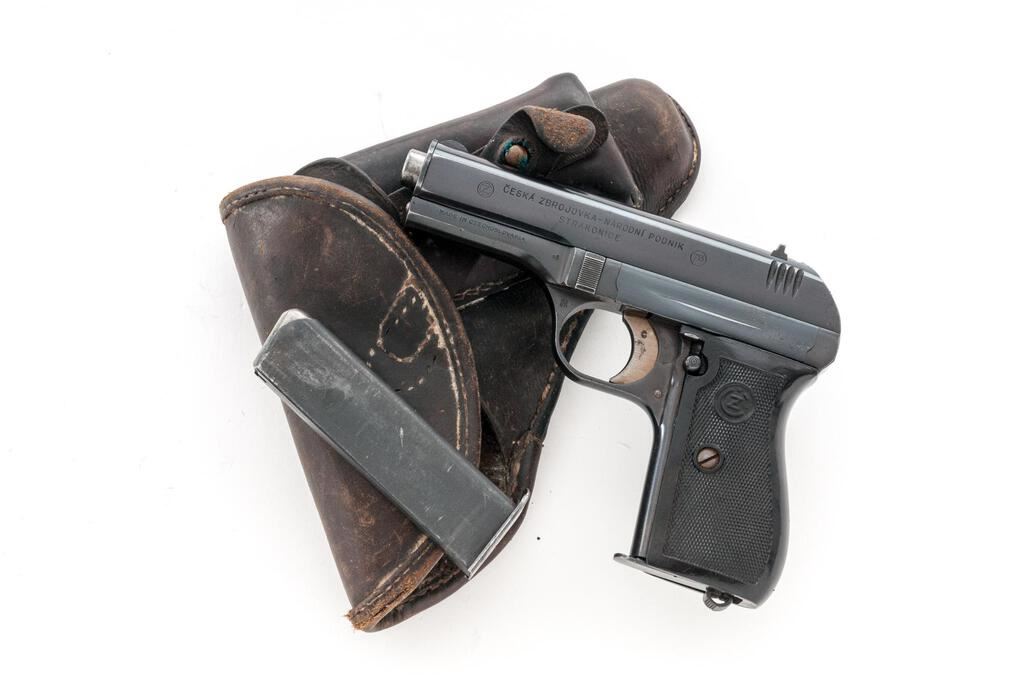 Czech Model CZ-27 Semi-Automatic Pistol, with Holster and Extra Magazine, #591972, .32 ACP cal., 3.9" barrel, blued finish, checkered one-piece black plastic grip with CZ logos on each side; blade front sight and drift adjustable rear sight with "V" notch. Pistol is marked on left-side slide with "(CZ logo)/CESKA ZBROJOVKA-NARODNI PODNIK/STRAKONICE". Left-side frame stamped "MADE IN CZECHOSLOVAKIA" and "48". There is a "(lion)N" proof stamp in the left-side front trigger guard web. One magazine is unmarked in very good condition, the other magazine is marked "P.Mod.27"and has a bent floorplate, otherwise good. Brown leather holster is marked on inside flap with a blurred ink stamp. A shoulder strap was removed from the rear flat. Holster condition is good with the dark pliable leather showing scratches and impressions to the surface. Pistol has matching numbers on frame and slide. Condition overall is very good with the metal retaining about 85% finish, showing areas of frosting to the frame, slide, and extractor. The straw-colored hammer and trigger show dark toning and some patina. Grip shows chips, scratches, and handling marks to the finish, otherwise good. Action operates smoothly, bright bore is excellent with well-defined rifling. No visible import marks. Est.: $500-$750. (C&R/PPT)