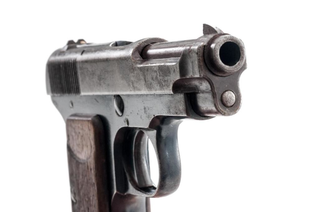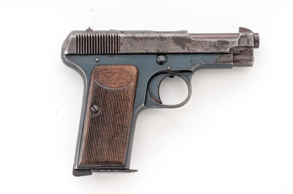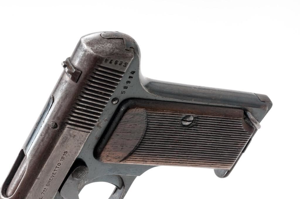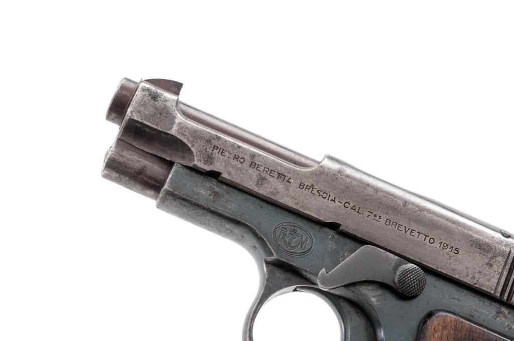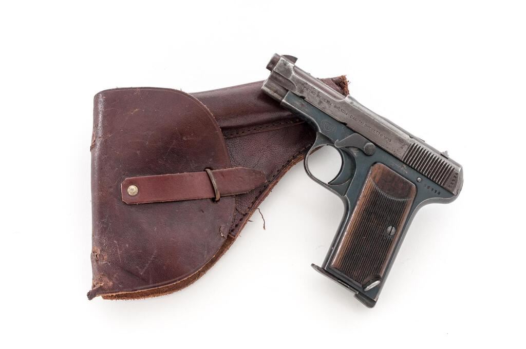 Beretta Model 1915/17 Semi-Automatic Pistol, with Holster, #58974, .32 ACP, 3.3"barrel, blued finish, two-piece hardwood grips with vertical checkering and "PB" logo on each side; blade front sight and drift adjustable rear sight with "V" notch. Pistol is marked on left-side slide "PIETRO BERETTA BRESCIA-CAL.7.65 BREVETTO 1915". Left-side frame is stamped with a "R(anchor)M" Italian Navy issue stamp. Magazine is unmarked and in about good condition with areas of patina to the finish. The brown leather holster is unmarked and in fair condition with chew marks along the top edge. Pistol has matching numbers on frame and slide. Condition overall is about good. The slide retains no finish, now showing areas of patina, especially to the right side. The frame retains about 70% of its finish, with spots of patina to each side. Grip logos are considerably faded and the vertical checkering shows flattening and scratches. Action operates smoothly, bore has darkening in the grooves with fair to good rifling. No visible import marks. Est.: $500-$700. (C&R/PPT)