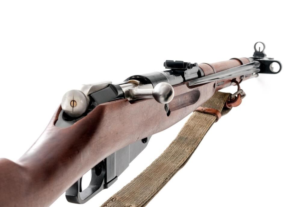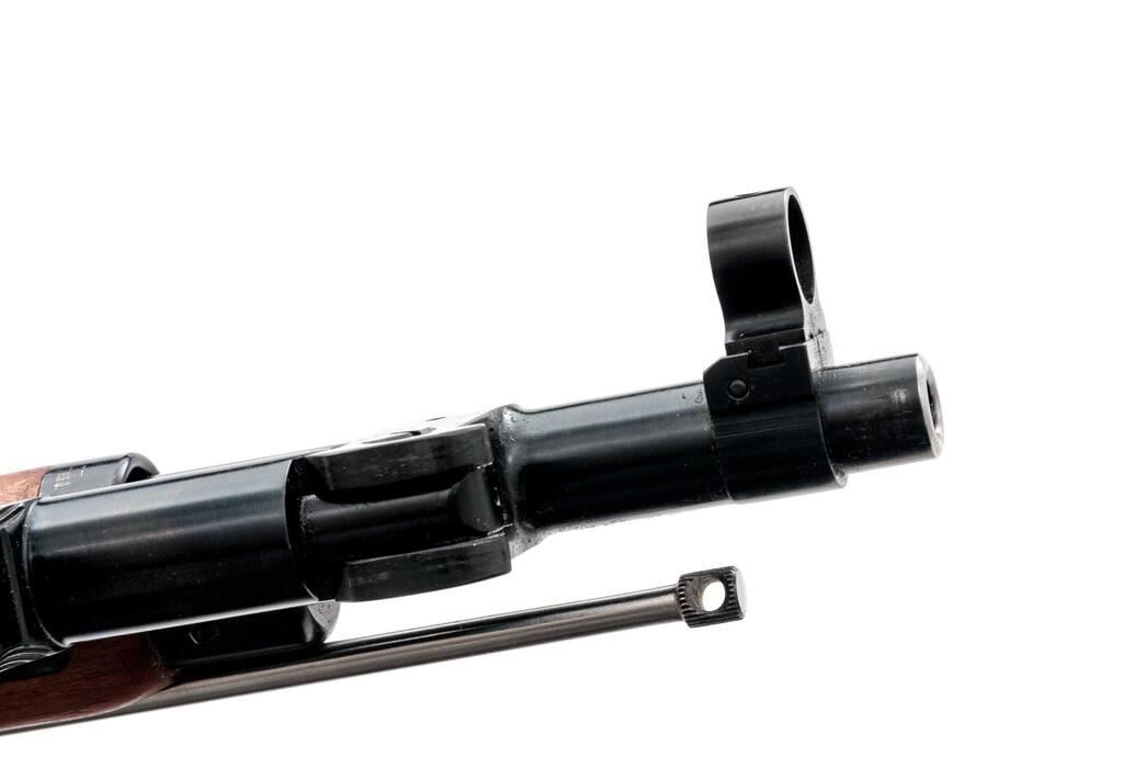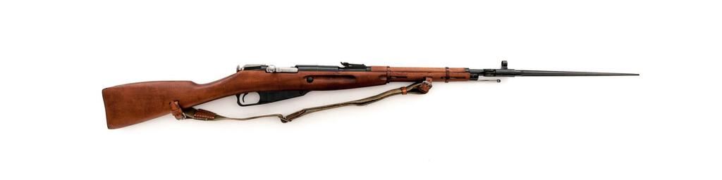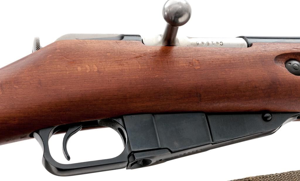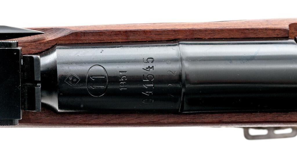 Polish M44 Mosin-Nagant Bolt Action Carbine, with Folding Bayonet, #C41545, 7.62x54Rmm, 20.5" barrel, blued finish, hardwood stock set, hooded post front sight and adjustable tangent rear sight. Cleaning rod fitted under barrel and a good condition Polish cotton sling is attached. The folding bayonet is in excellent condition and operates smoothly. Marked on barrel shank with a "Circle 11" arsenal code above "1951"/serial number, and a second, faint serial number. "OW/Diamond" stamp on right side buttstock. Matching numbers on bolt handle, magazine, and buttplate. Condition overall is very good with the metal retaining over 95% finish, both barrel bands now a reddish color. Wood has had a light stain applied, now very good, showing chips to the right-side forend. Action operates smoothly, bright bore is excellent with sharp well-defined rifling. Import stamped on left side of receiver. Est.: $600-$800. (C&R)