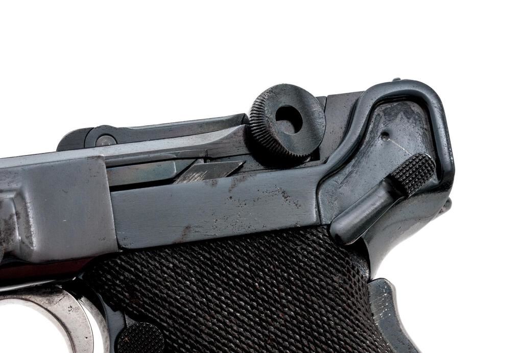 1900 American Eagle Commercial DWM Luger Semi-Automatic Pistol, #7796, 7.65mm Luger (.30 cal. Luger), 4.75" barrel, blued finish, dished toggles, DWM marked center toggle link, American eagle on top of chamber, grip safety, no stock lug, drift adjustable saw tooth type front sight, integral fixed rear sight with small "v" notch, all visible numbers matching, checkered wood grips, and one nickel-plated magazine with an unmarked wood base. No "Germany" or "Made in Germany" markings. Condition is good as refinished, with a high-polished salt blued finish, showing heavy polishing to the various parts, some wear and light pitting on the sideplate, left side of frame above the grip, wear on the front and rear grip straps, wear and thinning to the grip safety, some grinding and polishing marks not removed inside the rear frame ears, and wear lines from firing. Trigger, extractor, and ejector spring have been chrome plated and show minor old pitting under the plating. Action, hold open, and safeties function properly; bore is frosted overall with definable lands and grooves. Grip safety feels sticky and may need some cleaning or lubrication. Grips have been varnished and stained almost black, with light gouges and dings, flattening to the diamonds, and left grip is missing a small piece by the safety lever. Grip screws show light wear to the tops with clean slots. Magazine shows light wear from use on the body with minor spotting. Wood base has a tight hairline crack, a small ding in one roundel, and has been lightly varnished. Est.: $700-$1,000. (C&R/PPT)