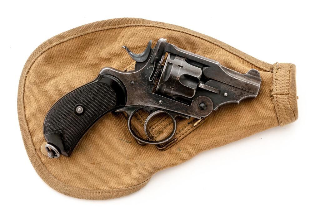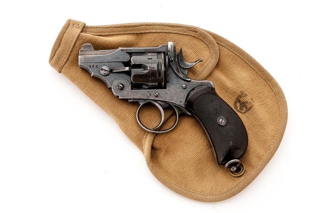 Modified British Webley Mark 1 Double Action Revolver, with Holster, #15342, .45 ACP cal., 2.4" barrel, blued finish, black plastic grips, blade front sight and fixed "U"-notched rear sight. Marked on left-side frame "WEBLEY PATENTS" around "MARK 1". Left-side barrel top strap stamped with Victorian proof and view stamps. Royal Navy issue "N" stamp on top of grip swell and on left side of frame. Large "Broad Arrow" symbol engraved into top of barrel strap. Matching numbers on frame, barrel, and (partially) on edge of cylinder. Revolver has been modified by milling off the rear of the cylinder to chamber the .45 ACP cartridge. Barrel has been shortened and the top rib cut to accept the front sight. Condition overall is good as modified, with the metal retaining approx. 50% finish showing dents and areas of patina. Right-side grip has been repaired on the bottom edge, otherwise the grips are good, showing fading, chips, and flattening to the checkering. Action locks up tight and operates smoothly; bright bore is very good, chambers are clean and bright. "ENGLAND" import stamp on left side of barrel. The Canadian made holster is partially ink stamped on the inside flap "ZL&T.LTD/1943/C Broad Arrow" stamp. It has been cut down to fit the modified revolver. Holster condition is very good with a bright color, showing light stains to the exterior. Est.: $600-$900. (C&R/PPT)