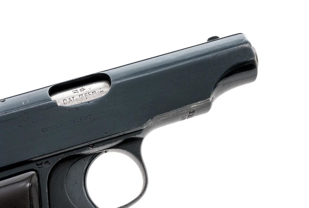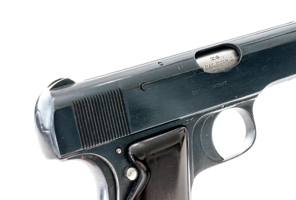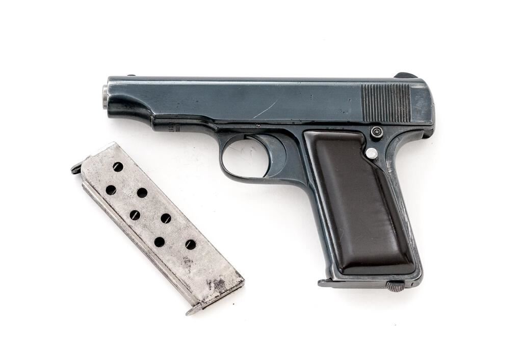 German Ortgies Semi-Automatic Pistol, with Extra Magazine, #231627, .32 ACP cal., 3.4" barrel, blued finish, brown plastic grips, blade front sight and fixed rear sight with "U" notch. Magazine #1 has seven witness holes and is marked on the floorplate with the Ortgies trademark long tail cat logo and "CAL. 7.65". Condition is good retaining approx. 60% nickel finish now showing dark spots and patina. Magazine #2 has six witness holes and is unmarked. Condition is very good showing light finish wear. Pistol markings have been removed from left-side slide; right-side slide is marked "ORTGIES PATENT". Barrel is marked "7,65 mm" at ejection port. "(Crown)N" proofs are stamped on barrel and right-side frame. Condition overall is good retaining approx. 90% of the reblued finish, which was applied over old pitting, now showing patina and wear to the front and rear grip straps. The replacement plastic grips have no logo attached. Condition is very good showing light handling marks. Action operates smoothly; bore has darkening in the grooves and an area of old patina, otherwise good with very good rifling. Est.: $250-$450. (C&R/PPT)