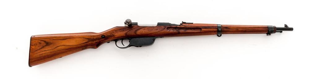 Budapest M95 Mannlicher Straight-Pull Bolt Action Rifle, #M9510598, 8X56Rmm, 19.75" barrel, blued finish, hardwood stock set, inverted "V" front sight and adjustable folding leaf rear sight with "V" notch. Marked on top of receiver ring "(eagle stamp)/BUDAPEST/M95". Barrel shank stamped with large "S" and "W/eagle stamp/34". Matching original serial numbers (5725). Condition overall is very good as arsenal reconditioned and shortened after WWI, with the metal retaining approx. 95% finish showing surface patina to the bright bolt knob. There is a chip and crack to the hand guard forward of the front band, otherwise the wood is very good, showing mostly light handling marks to the varnished finish. Action operates smoothly; bore has darkening in the grooves, otherwise good with good defined rifling. Importer engraved and re-serial numbered on left side of receiver. Est.: $300-$500. (C&R)