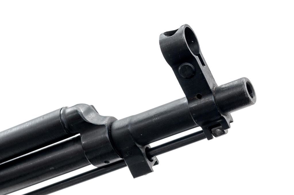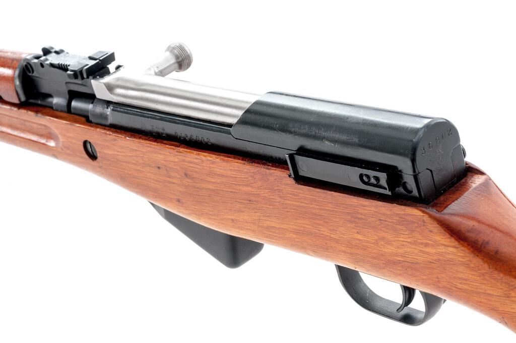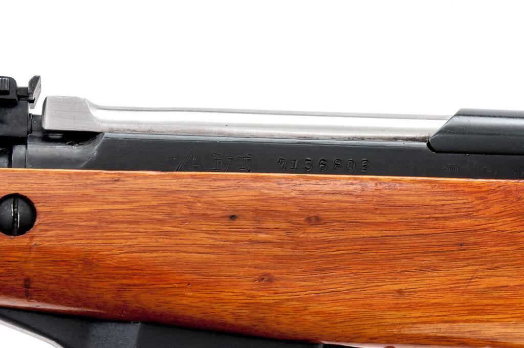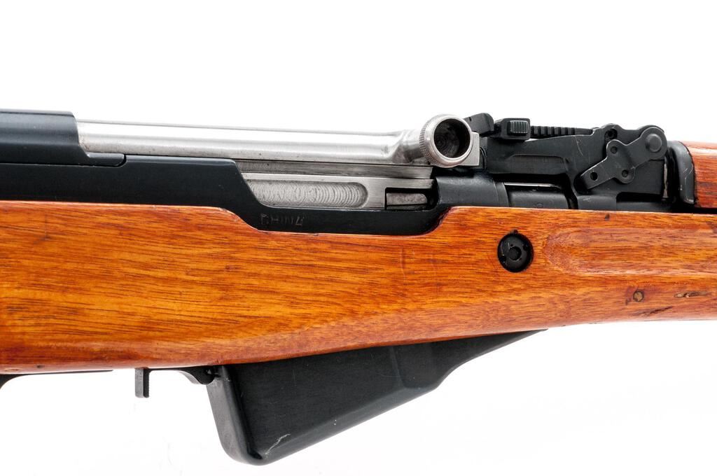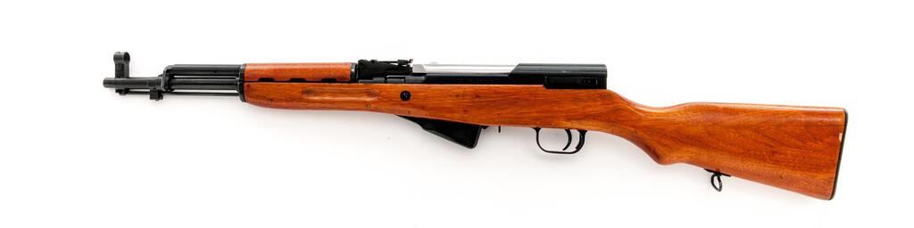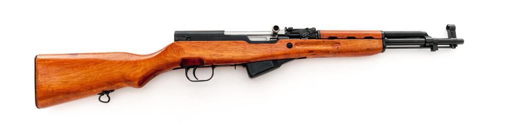 Chinese "Paratrooper" SKS Semi-Automatic Carbine, #7136802, 7.62x39mm, 16.5" barrel, blued finish, hardwood stock set, hooded post front sight and adjustable leaf rear sight. Cleaning rod is mounted under the barrel, and the cleaning kit is inside the butt trap. Marked on left-side receiver with a "Triangle 26" arsenal stamp and three characters for "Type 56 Carbine". There is a "(circle)/LJ" stamp on the right-side buttstock. Visible numbers match. Condition overall is very good with approx. 95% finish remaining on the metal. There is a crack thru the comb of the stock forward of the buttplate. Otherwise, the wood is good with scuffs and scratches to the finish. Action operates smoothly, bright bore is very good with very good rifling. Import stamped on both sides of receiver. Est.: $600-$800. (C&R/PPT)