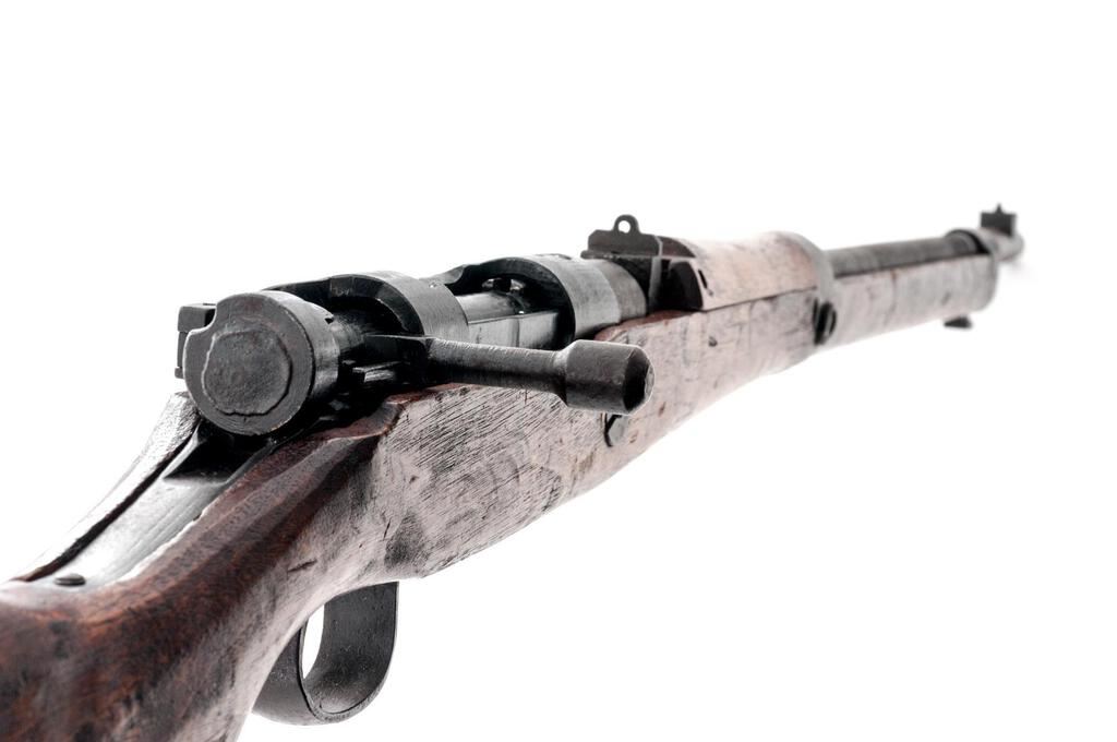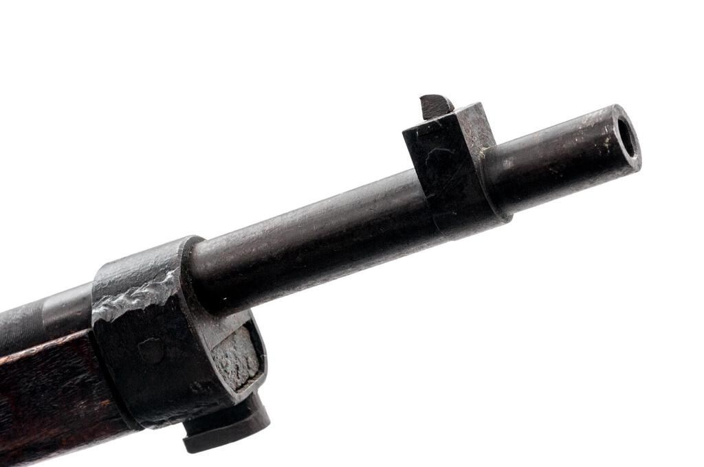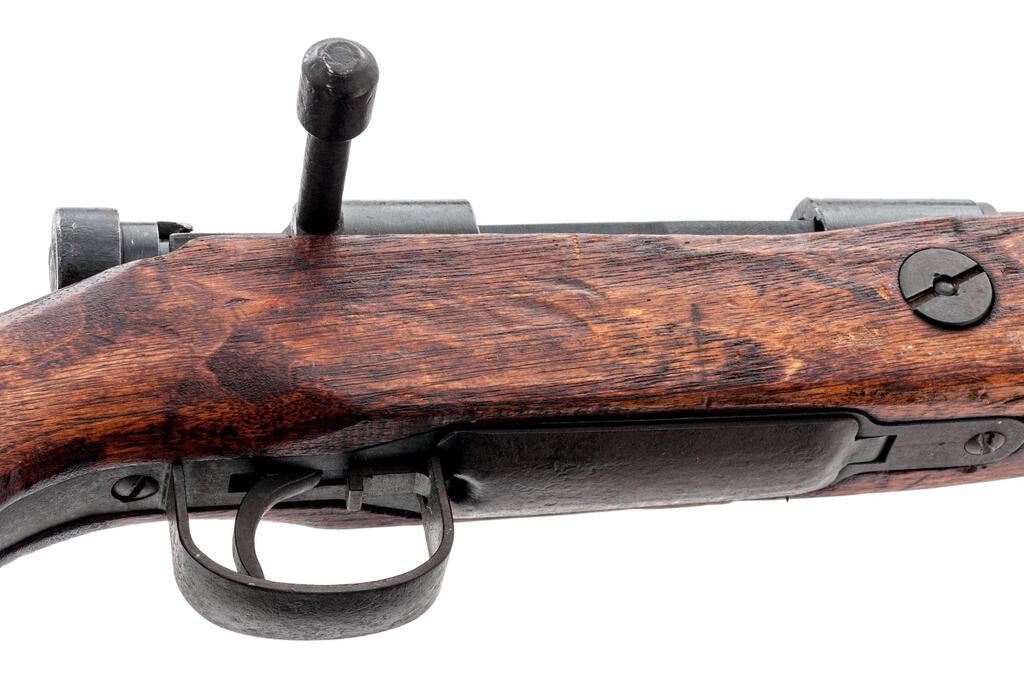 Last Ditch Japanese Type 99 Arisaka Bolt Action Rifle, #13821 ,7.7x58mm, 25.5" barrel, blued finish, two-piece hardwood stock, inverted "V" front sight without protectors and fixed rear sight with aperture. Rifle is Last Ditch type with wooden buttplate, simplified bolt handle, and forend without provision for cleaning rod. Marked on top of receiver ring with intact Mum crest but without model number. Stamped on left-side receiver with an Eighth Series mark and the symbol for the Nagoya Arsenal. Matching numbers on bolt handle and extractor. Condition overall is good with approx. 50% of the metal frosted with a rust patina. Wood is good with scattered chips, dents, and scratches to the dark finish. Action functions, but the cocking piece fits loosely and must be manually aligned to operate smoothly; bore is good with good shallow rifling. Est.: $400-$600. (C&R)