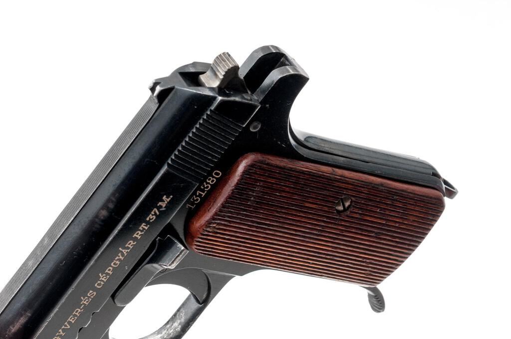 Hungarian Femaru FEG 37M Semi-Automatic Pistol, #131380, .380 Auto cal., 4" barrel, blued finish, grooved hardwood grips, drift adjustable blade front sight and fixed "V"-notched rear sight. Marked on left-side slide "FEMARU-FEGYVER-ES GEPGYAR R.T. 37M.". Magazine floorplate marked "37M". Condition overall is very good with the metal retaining over 80% finish, showing pitting and wear around the muzzle and finish loss and scratches extending back toward the ejection port. Magazine is good with scratches and wear around the feed lips. Grips are good showing scratches, chips, and flattening to the darkened finish. Action operates smoothly, bright bore is very good with very good rifling. No visible import marks. Est.: $700-$900. (C&R/PPT)