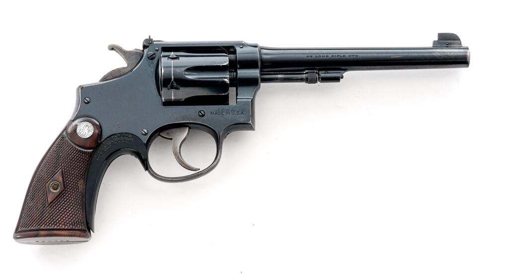 Smith & Wesson K-22 Outdoorsman 1st Model Double Action Revolver, #632325, .22 L.R. cal., 6" pinned barrel, pinned Patridge front with brass insert and pre-micrometer adjustable rear sights, humpbacked hammer, blue finish, K-frame, diamond checkered walnut medallion two-piece grips, grip shoe, and 6-rd. cylinder. Mfg'd 1933. Revolver is in very good overall condition retaining approx. 85%-88% thinning high polish blue finish, with losses at the muzzle, index line on the cylinder, and edgewear on the frame. Additionally, the cylinder shows wear at the flutes. Trigger and hammer show muted case colors and all visible serial numbers are matching. Grips are very good and fit well. The interior of the grips display the matching serial number on the right panel. Bore is very good, action locks up tight and the timing is good on this desirable pre-war K-22. Est.: $700-$900. (C&R/PPT)