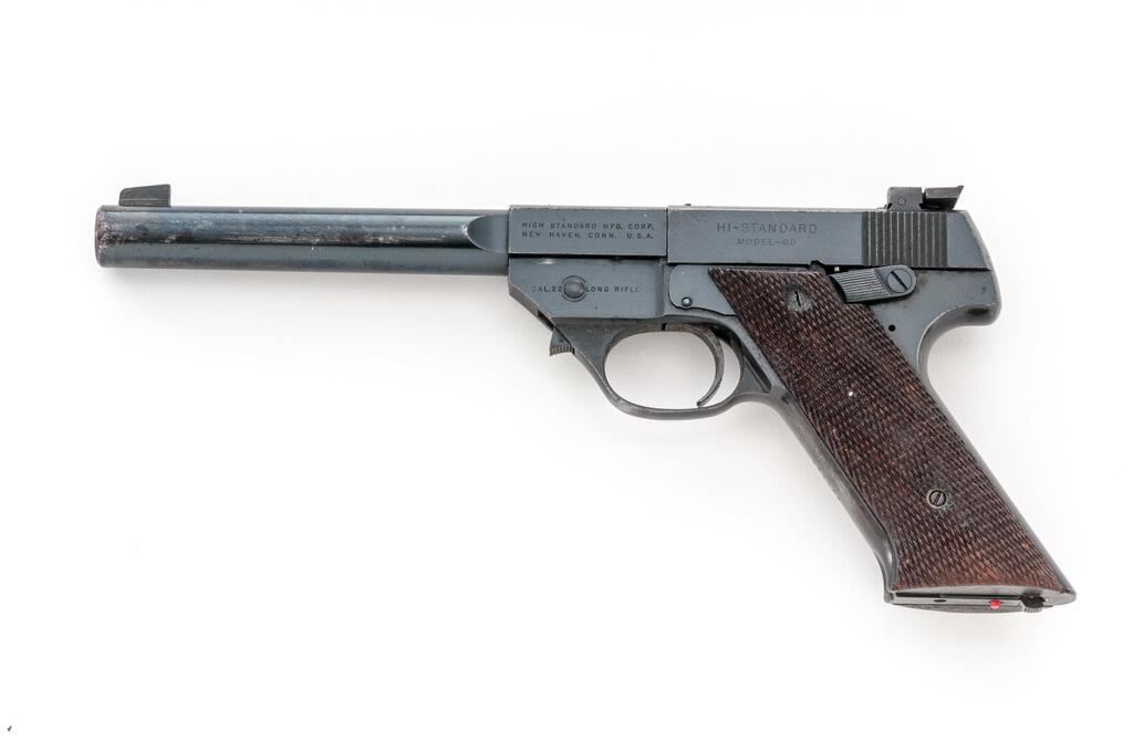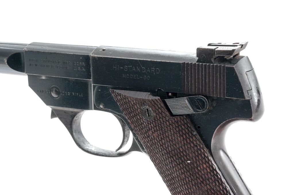 Hi-Standard Model GD Semi-Automatic Pistol, #324358, .22 L.R. cal., 6.75" medium heavy barrel, blade front and adjustable "Davis" rear sights, lever takedown, blue finish, checkered walnut two-piece grips, and one 10-shot magazine. Left barrel lug is marked "HIGH STANDARD MFG. CORP./NEW HAVEN, CONN. U.S.A." Mfg'd 1948. Pistol is in very good overall condition retaining approx. 80%-85% thinning blue finish, with moderate wear and loss of finish along the barrel, slide, and front and rear grip straps. There are small areas of light surface rust and roughness with light scratches and some dried oil. Grips are good showing some flattening of the checkering and small mars associated with carry and use. Action functions well, bore is very good. Est.: $300-$500. (C&R/PPT)