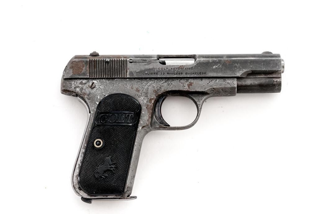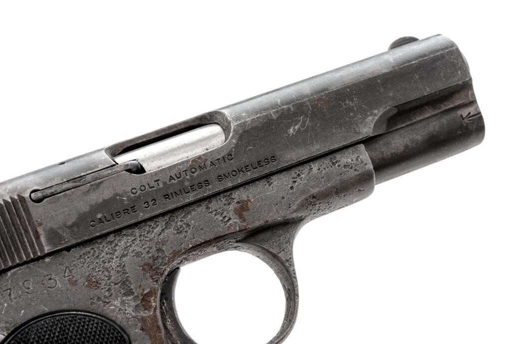 Colt Model 1903 Pocket Hammerless Semi-Automatic Pistol, #7934, .32 ACP cal., 3.75" barrel, blade front and "U"-notched fixed rear sights, no finish, checkered hard rubber Colt grips, and 7-rd. replacement magazine. Mfg'd 1904. Pistol is in fair overall condition having gone to an even gray patina, with scratches, mars, and small areas of light surface rust. There is a legible Rampant Colt emblem at the left rear of the slide. Checkered hard rubber Colt grips are in good condition. Bore is fair and the action functions on this early 1903 Pocket that would benefit from some TLC. Est.: $300-$500. (C&R/PPT)