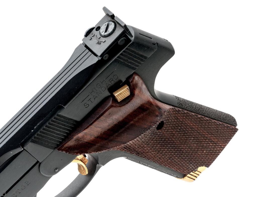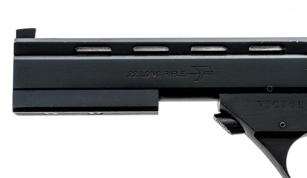 Hi-Standard Victor Semi-Automatic Target Pistol, #ML73077, 5.5" barrel with a full-length ventilated rib, blade front and integral adjustable sights, blue finish, checkered walnut two-piece thumb rest grips, factory stippled front and rear straps, two (2) 10-rd. magazines, barrel weights, and push-button takedown. Frame is marked "VICTOR" on left side; right side of slide is marked "HIGH STANDARD INC./E. HARTFORD, CONN. U.S.A." Mfg'd 1980. Pistol is in fine overall condition retaining approx. 93%-95% factory blue finish, with light scratches and edgewear associated with carry and use. Factory grooved trigger, safety, and magazine release are finished in gold tone. Grips are very good with sharp checkering. Action is crisp, bore is good with defined rifling. Lot includes two (2) correct 10-rd. magazines. Est.: $500-$700. (Modern/PPT)
