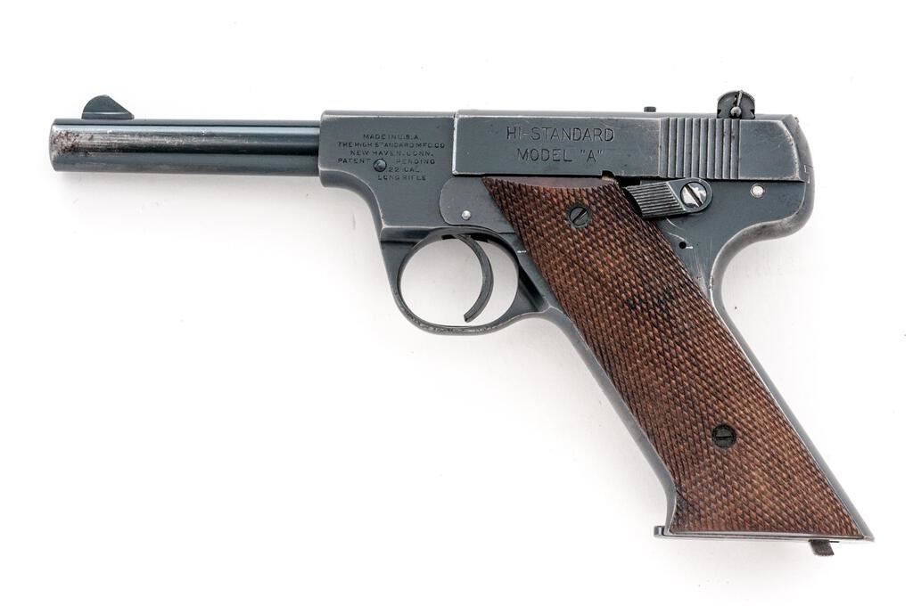 Hi-Standard Model A Semi-Automatic Pistol, #91462, .22 L.R. cal., 4.5" barrel, blade front and square-notched adjustable rear sights, blue finish, checkered two-piece walnut grips, with one correct unmarked 10-rd. magazine. Left barrel lug is marked "MADE IN U.S.A./HIGH STANDARD MFG. CORP./NEW HAVEN CONN." Mfg'd 1941. Pistol is in very good overall condition with moderate wear and thinning at the muzzle and along the barrel. There is highpoint edgewear along the frame and slide, some areas of loss of finish on top of the slide and small scratches evident. Front and rear grip straps show thinning blue finish with even wear. Grips are about good with some flattening of the checkering. Action locks up tight, bore is very good with crisp rifling. Est.: $400-$600. (C&R/PPT)