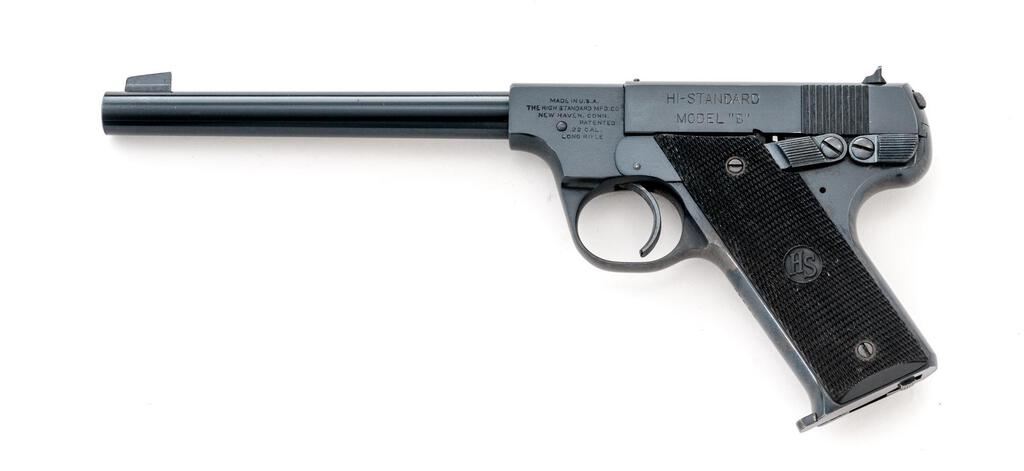 Hi-Standard Model B Semi-Automatic Pistol, #35854, .22 L.R. cal., 6.75" lightweight barrel, Patridge type front and fixed rear sights, blue finish, checkered hard rubber H.S. monogram grips, and one correct two-tone 10-rd. magazine. Mfg'd 1938. Pistol is in near excellent overall condition with only light handling and storage marks, retaining approx. 96% factory blue finish. Grips are very good and checkering is sharp. Action is crisp, bore is very good. Est.: $500-$750. (C&R/PPT)