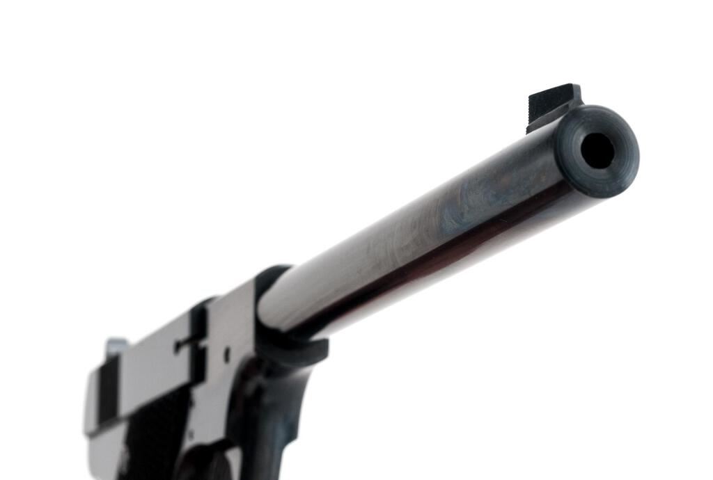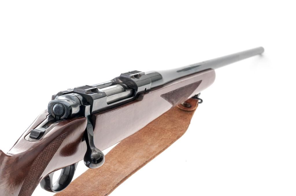 Ruger M77 Bolt Action Rifle, #75-36383, 7mm Rem Mag. cal., 24" barrel with no provision for sights, integral bases, tang-mounted safety, blue finish, checkered walnut one-piece pistol grip stock, with a ventilated rubber Whiteline recoil pad, sling swivels, and a period leather rifle sling. Mfg'd 1981. Rifle is in very good overall condition retaining approx. 90% factory blue finish, with light scratches, wear at the muzzle, some surface erosion, dried oil and such on the barrel. The small mars and marks are consistent with field use. Bolt is serialized to the rifle with a matching number. Checkered walnut stock is in good condition with intermittent scratches and mars from carry and use. Rifle features a desirable tang safety, and the ventilated rubber pad provides a 14-1/4" LOP. Action is crisp, bore is very good with well-defined rifling. Est.: $500-$750. (Modern)
