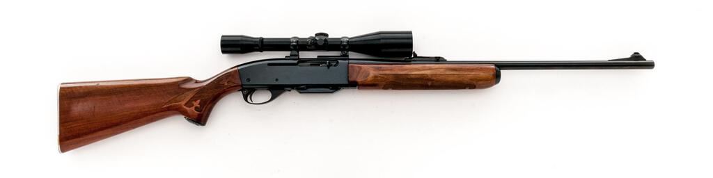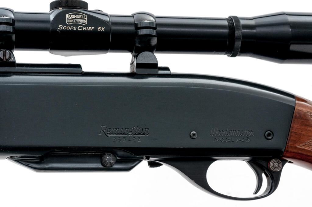 Remington Model 742 Woods Master Semi-Automatic Rifle, #265422, 6mm Rem. cal., 22" barrel, brass bead ramped blade in the factory dovetail front and "U"-notched adjustable rear sights, blue finish, checkered wood two-piece pistol grip stock with a checkered aluminum buttplate, 4-rd. detachable box magazine and two-piece base, rings, and a Bushnell Scope Chief 6x fixed-power rifle scope in gloss black with a fine wire reticle providing clear optics. Mfg'd 1967. Rifle is in fine overall condition retaining approx. 94%-95% original blue finish with light handling and storage marks only. There are some small marks on the trigger guard. Checkered wood stock is very good with light scratches and nice figure in the buttstock, ending with a checkered aluminum buttplate providing a 13.25" LOP. Action functions smoothly, bore is very good. Est.: $600-$800. (C&R/PPT)