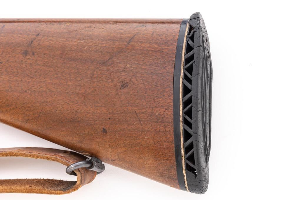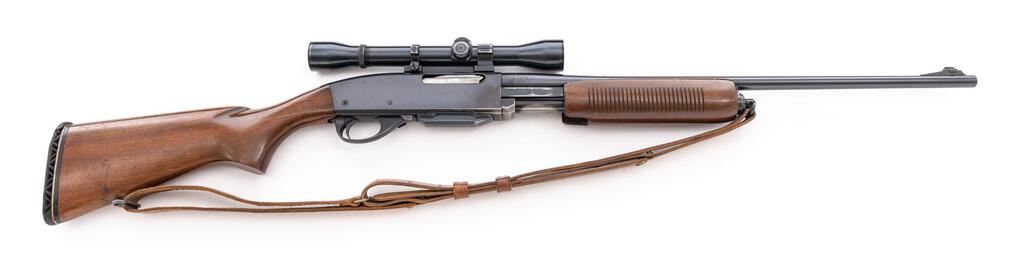 Remington Model 760 Game Master Slide Action Rifle, #230069, .270 Win. cal., 22" round barrel, factory dovetailed steel bead blade front sight with the rear sights removed and left vacant, blue finish, smooth wood two-piece pistol grip stock, detachable box magazine, sling swivels, and a period leather military style rifle sling. Topped with Redfield one-piece base and rings, with a matte finished Weaver steel tube K4 fixed-power scope with fine wire crosshairs providing crisp, clear optics. Rifle mfg'd 1954. Rifle is in very good overall condition retaining approx. 90% thinning blue finish, with light wear at the muzzle and small scratches along the barrel. Receiver shows significant toning blue finish with thinning and edgewear, particularly on the underside. Smooth wood stocks are in very good condition with scrapes and mars consistent with field use. Buttstock has been cut and ends with a deteriorated ventilated rubber recoil pad providing a 12.75" LOP; 12.25" to end of wood. Action works smoothly, bore is good with defined rifling. Est.: $500-$750. (C&R)