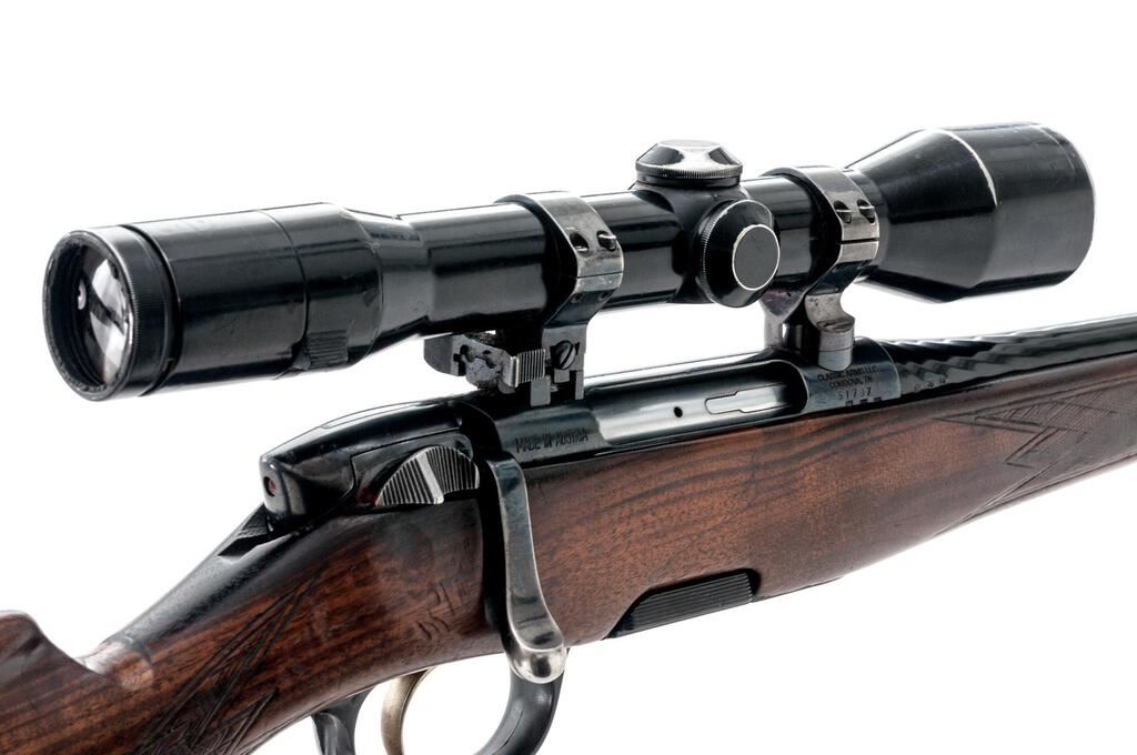 Steyr Arms (Mannlicher) Model L Bolt Action Carbine, #61787, .22-250 cal., 20" cold hammer-forged barrel with no accommodation for sights, blue finish, checkered wood one-piece full-length Mannlicher style pistol grip stock with cheekpiece and a solid rubber Steyr marked recoil pad, 5-shot rotary magazine and butter knife bolt handle with matching serial number. Carbine is topped with two-piece claw mounts and rings, with an unmarked variable-power scope in gloss black with a German #4 reticle with clear crisp optics. Scope shows considerable wear and has been refinished but appears to be quality glass. Carbine is in very good overall condition with thinning of finish and bare metal showing in several spots on the hammer-forged barrel. Receiver retains the majority of the factory blue with an import mark on the right front ring and the rear of the receiver marked "MADE IN AUSTRIA". There is finish loss on the butter knife bolt handle. The skip-line checkered wood Mannlicher stock is good with dents and compressions consistent with field use; there is some flattening of the checkering evident. Bore is good and action is smooth on this desirable Steyr Carbine. Est.: $1,000-$1,200. (Modern)