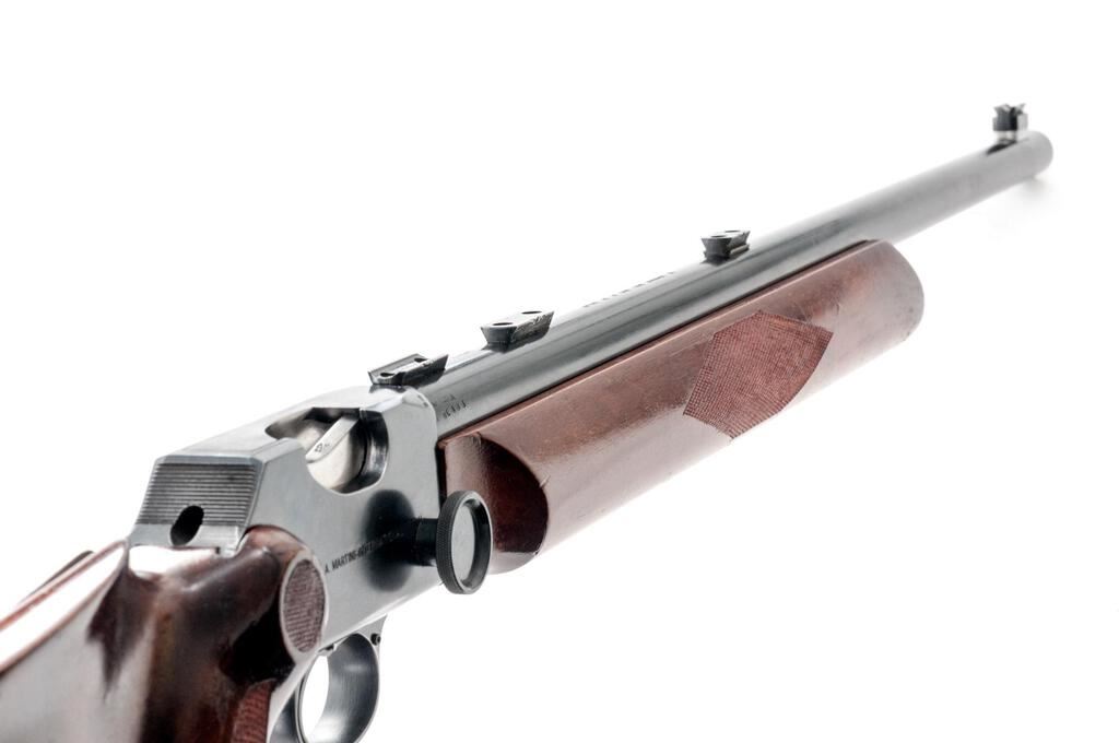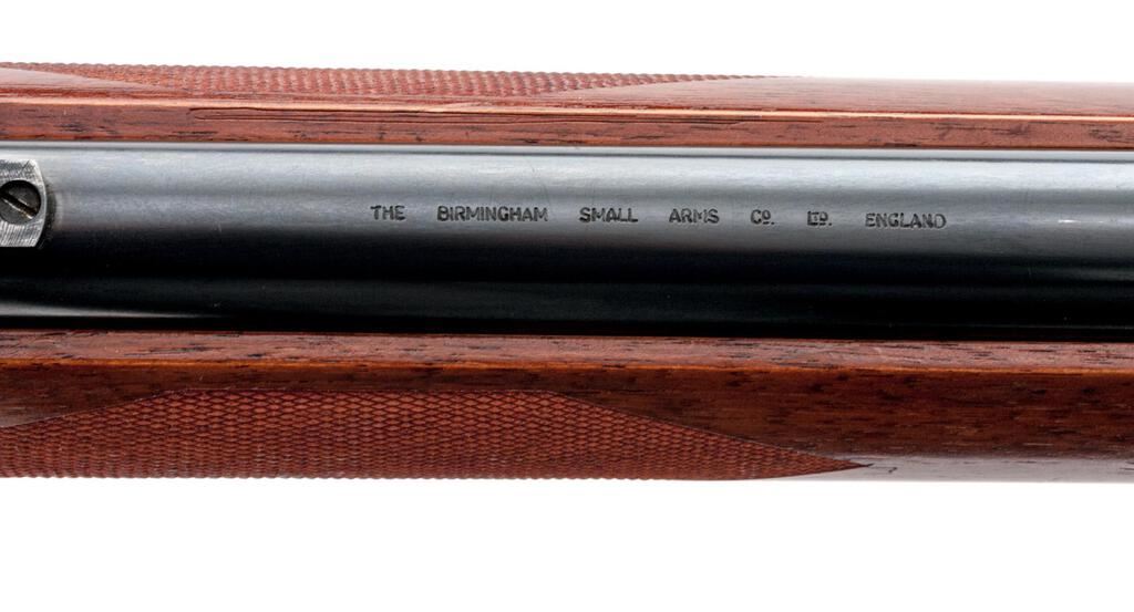 Birmingham Small Arms (BSA) Martini International MK II Single Shot Rifle, #E463, .22 LR cal., 29" round barrel, blued finish, smooth two-piece hardwood stock with diamond pattern checkering, and extended lever. Condition is very good overall. Metal surfaces showing minor handling marks, case colors on lever have faded. Wood with minor scratches and light impressions. Front and rear sights have been removed but bases remain. Forearm equipped with a 4.5" rail with 5 mounting holes. Mounting base for additional shell holder located on the left side of the receiver. Length of pull is 13" including a checkered solid wood buttplate, OAL is 43.5" and the rifle weighs 11.85 lbs. Bore is bright with well-defined rifling. Est.: $600-$800. (C&R)