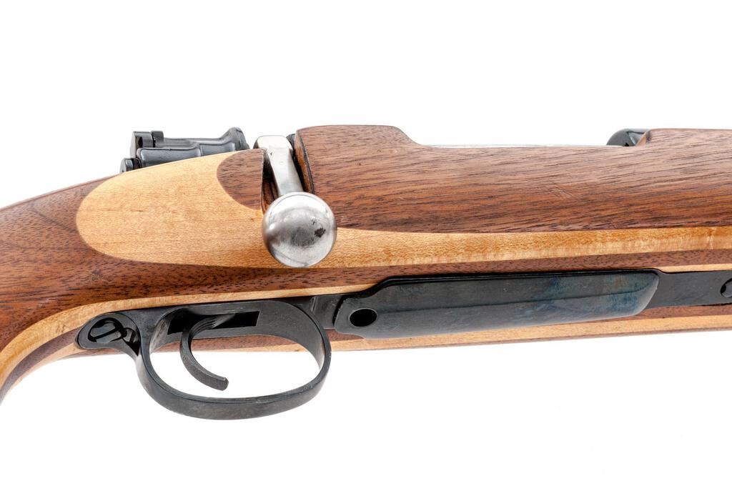 Custom BRNO VZ-24 Bolt Action Sporting Rifle, #D52923, .25-06 cal., 26" medium heavy barrel with no accommodation for sights, flag safety, bolt in the white, blue finish, smooth laminate wood one-piece pistol grip target stock with a Whiteline ventilated rubber recoil pad. Rifle is in fine overall condition with the custom barrel retaining approx. 96%-97% blue finish. Receiver retains a significant amount of blue with a Czech crest on the front ring. Front and rear rings have been drilled and tapped and left vacant. Trigger guard has been slimmed. The smooth laminate wood stock is very good with light scratches and handling marks, ending with a ventilated rubber recoil pad providing a 14.25" LOP. Action works well, bore is very good with clearly defined rifling. Est.: $400-$600. (Modern)