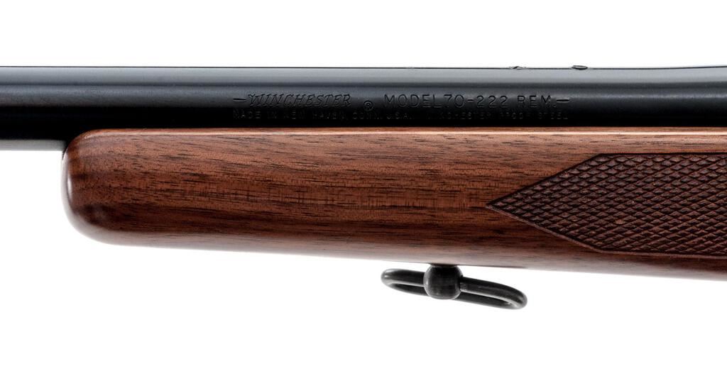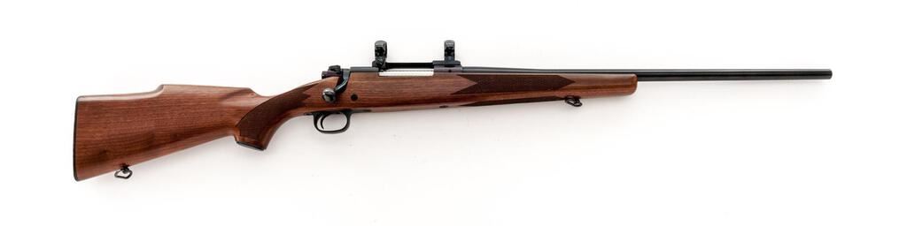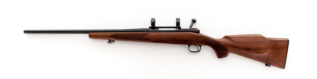 Winchester Model 70 Bolt Action Rifle, # G1228347, .222 Rem. cal., 22" barrel, factory front and rear sights removed and the holes filled with tap screws, blue finish, checkered walnut one-piece pistol grip stock with sling swivels and a Winchester marked checkered plastic buttplate, blind magazine, factory jeweled bolt with matching serial number, and topped with a Redfield one-piece mount and rings. Mfg'd 1975. Rifle is in near excellent overall condition retaining 97%-98% factory blue finish with light handling marks and small mars. The checkered walnut stock is very good with a couple of small mars and a dent at the comb, ending with a checkered plastic buttplate providing a 13.25" LOP. Action functions smoothly, bore is very good with crisp rifling. Est.: $700-$900. (Modern)