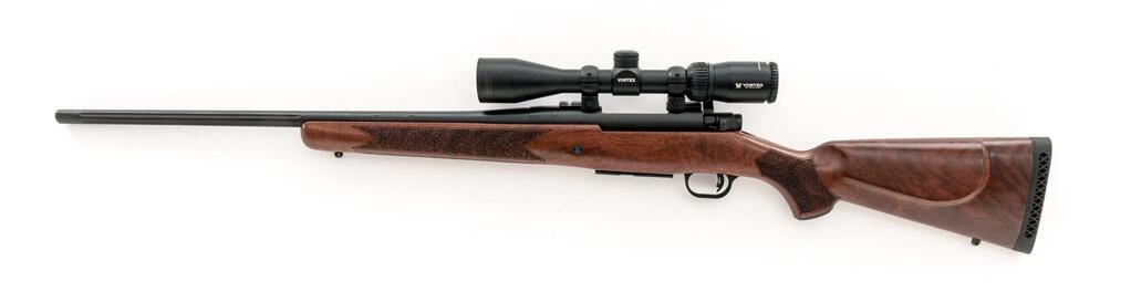 Mossberg Patriot Bolt Action Sporting Rifle, #MPR116589, .243 Win cal., 20" fluted barrel with no accommodation for sights, fluted bolt, matte blue finish, stippled walnut one-piece pistol grip stock with cheekpiece and ventilated rubber recoil pad, detachable 5-rd. box magazine, sling studs, Weaver bases and rings with a Vortex Crossfire II 3-9x40 rifle scope in matte black with a BDC (Bullet Drop Compensator) reticle. Scope shows clear, crisp optics. Rifle is in excellent overall condition showing little use with minor handling and storage marks. Walnut stock is very good with small mars and scratches, with a crossbolt added for stability. Buttstock ends with a Mossberg marked ventilated rubber recoil pad providing a 13.75" LOP. Action functions smoothly, bore is very good with crisp rifling. Est.: $400-$600. (Modern)