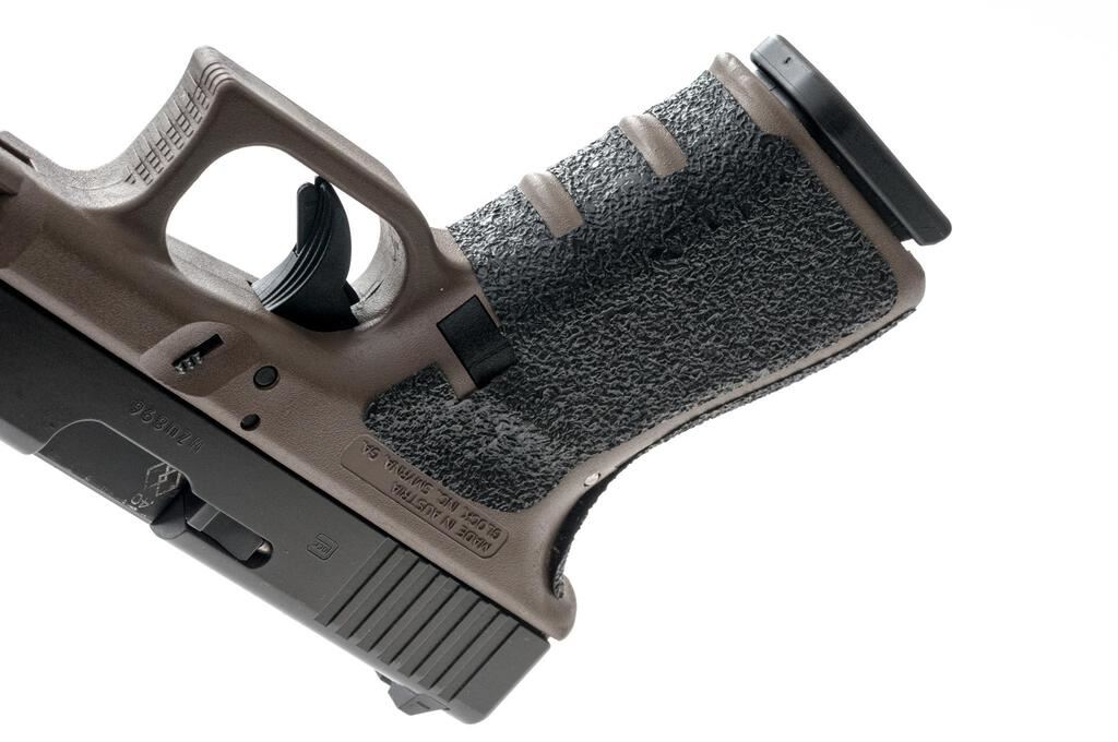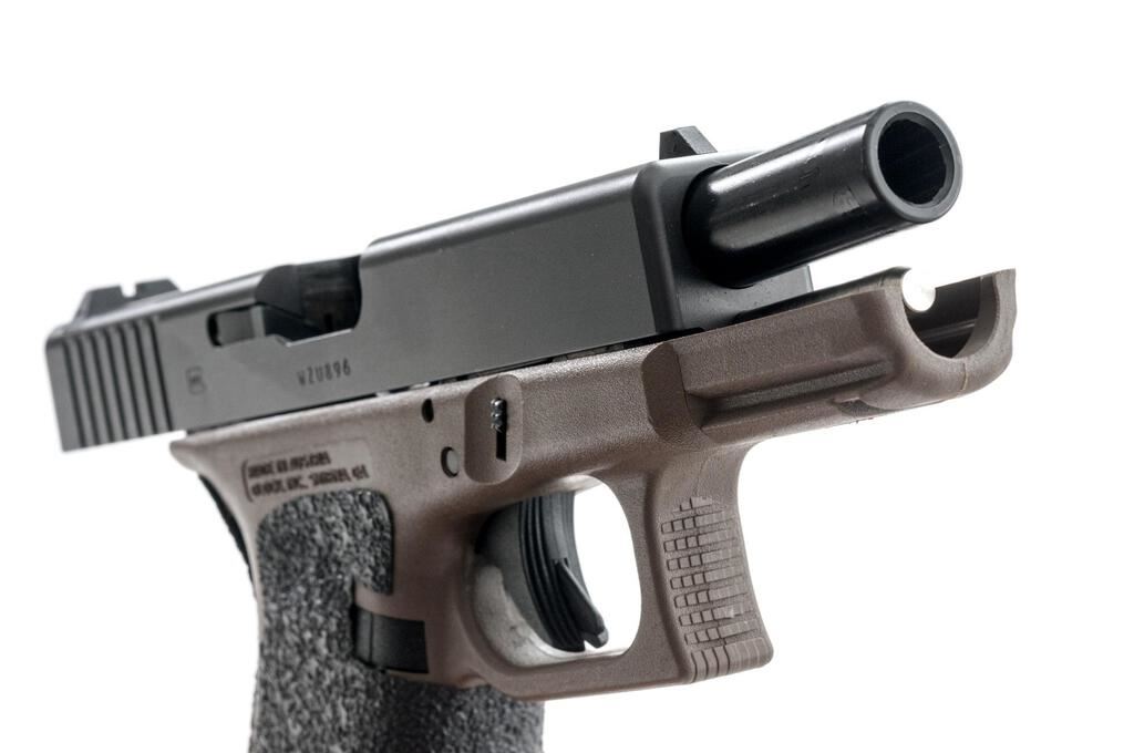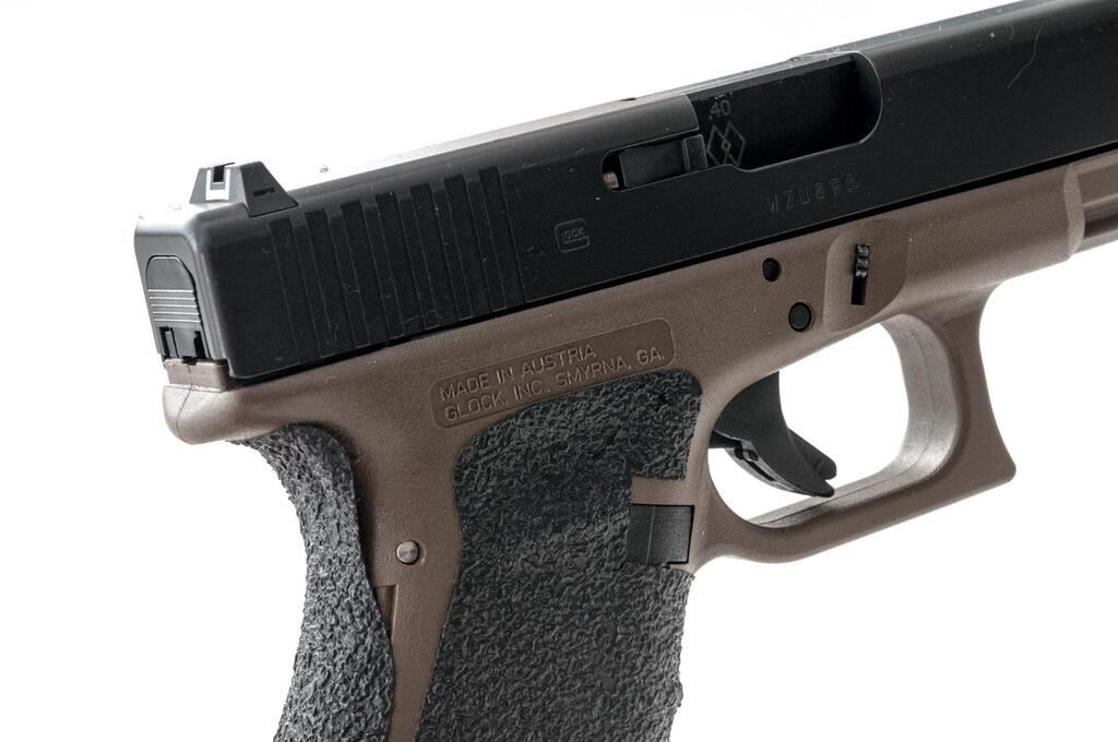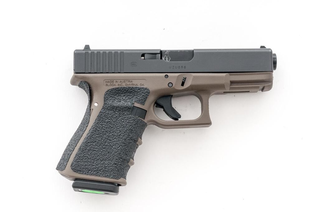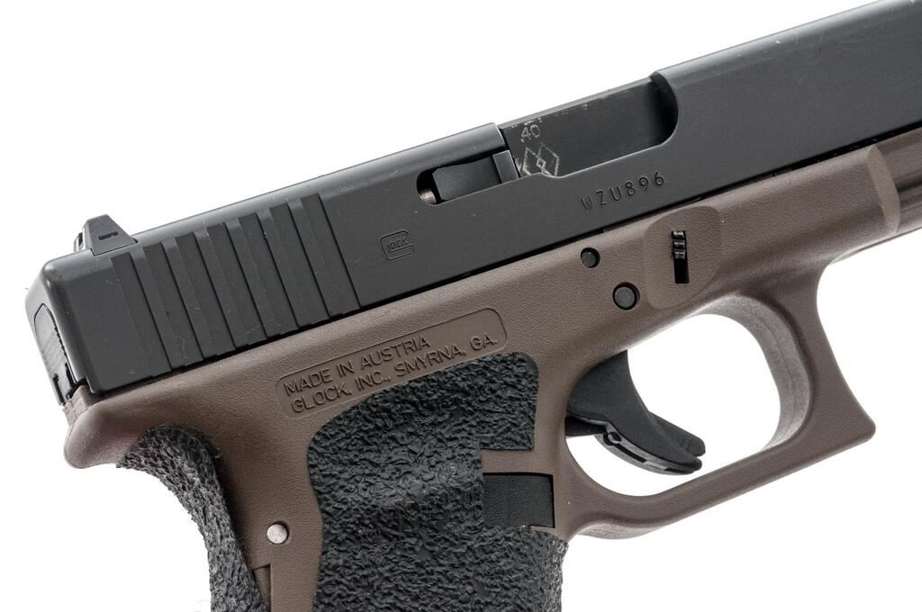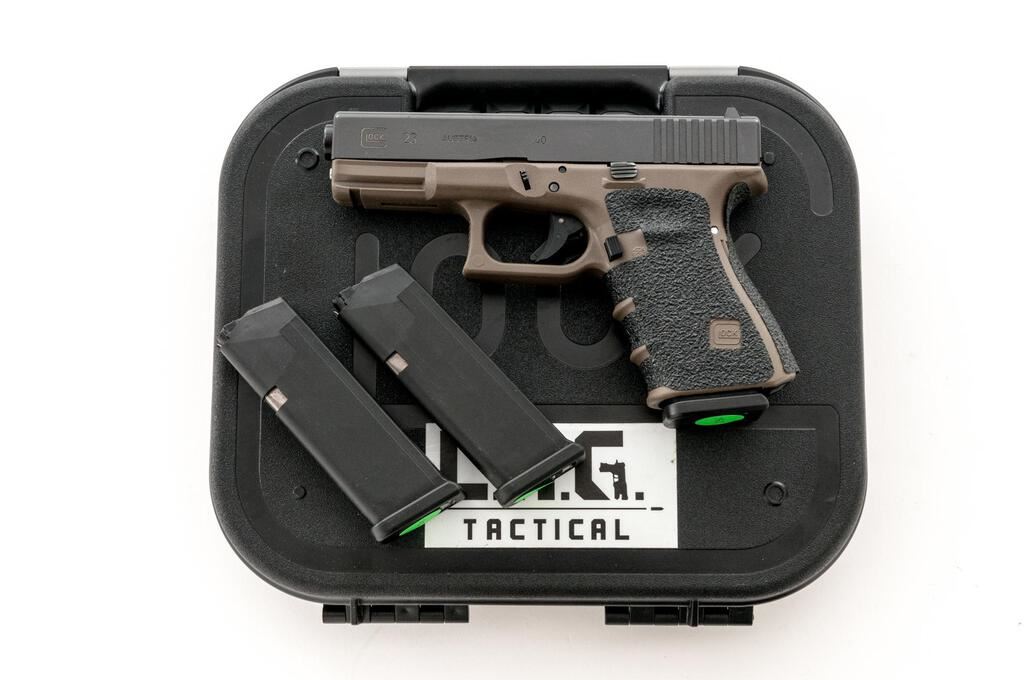 Glock Model 23 Gen 3 Semi-Automatic Pistol, #WZU896, .40 S&W cal., 4" replacement Double Diamond barrel, matte black slide, polymer OD green frame with lower accessory rail, white-dot front sight and white outline square-notched rear sight. Black textured grip tape has been added to the frame, as well as a Molon Labe grip plug. Includes three (3) 13-rd. Glock magazines. In a non-matching black plastic Glock case that is for a Model 19 pistol. Condition is excellent. Slide with a few slight scuffs and minor handling marks. The visible portion of the frame appears like new. The added grip tape is a little loose at a few of the edges. Excellent, smooth action. Bore is bright with strong rifling. Est.: $400-$500. (Modern) (Not available to Calif. residents.)