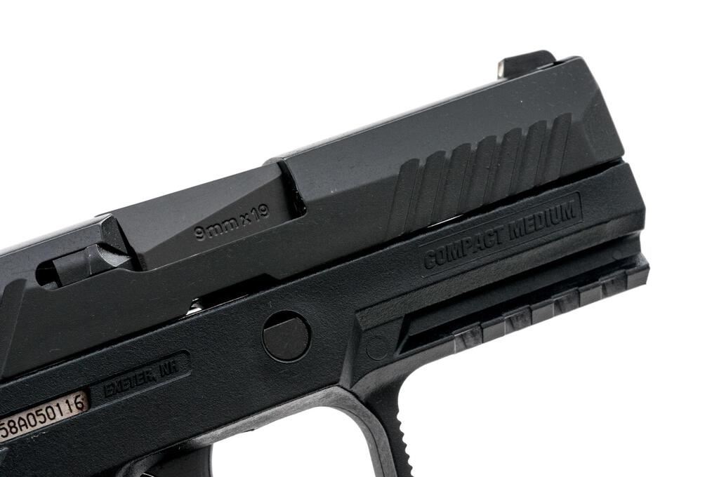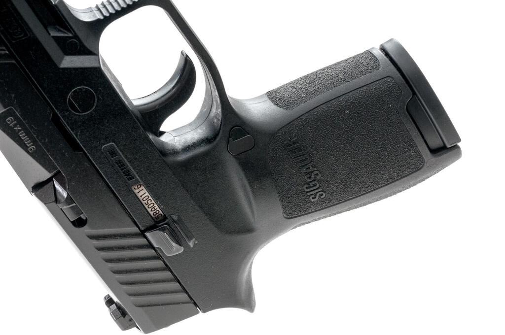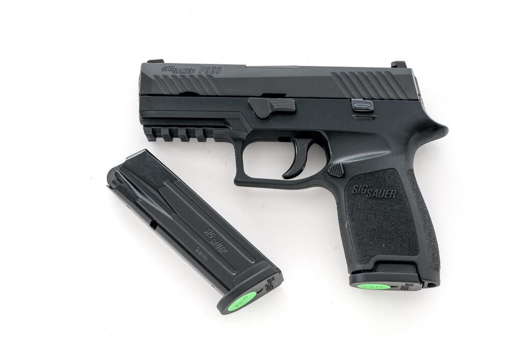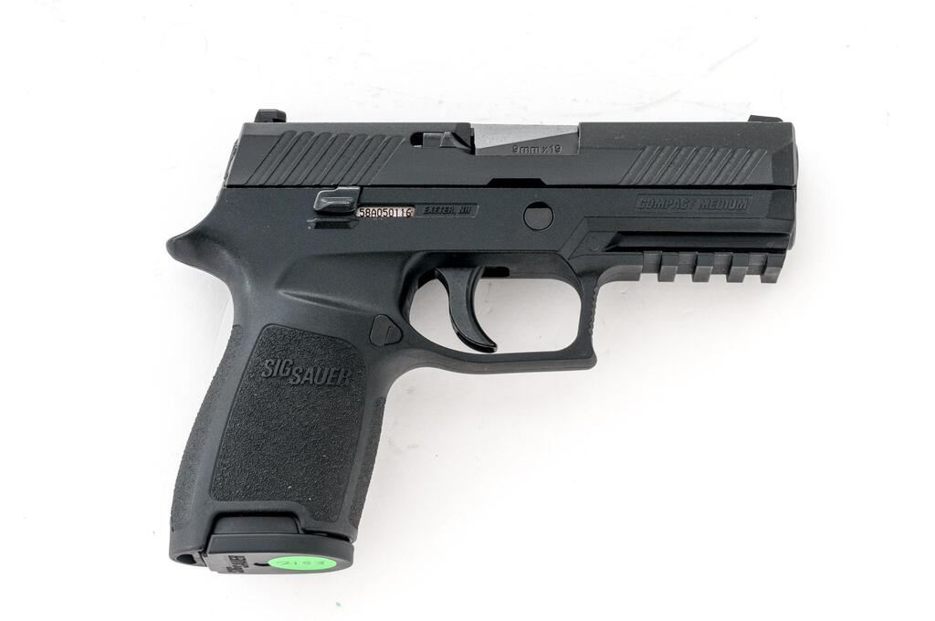Sig Sauer P-320 Semi-Automatic Pistol, #58A050116, 9mm, 3.9" barrel with three-dot sighting system, bobbed hammer, black Nitron finish, black textured polymer grips, accessory rail, two 15-rd. hi-cap magazines. Pistol is in excellent overall condition retaining approx. 98%-99% factory finish showing little use. Right side of frame is marked "COMPACT MEDIUM". Textured polymer grips are near excellent. Action is crisp, bore is very good with defined rifling. Est.: $400-$600. (Modern) (Hi-cap mags not available to Calif. residents.)