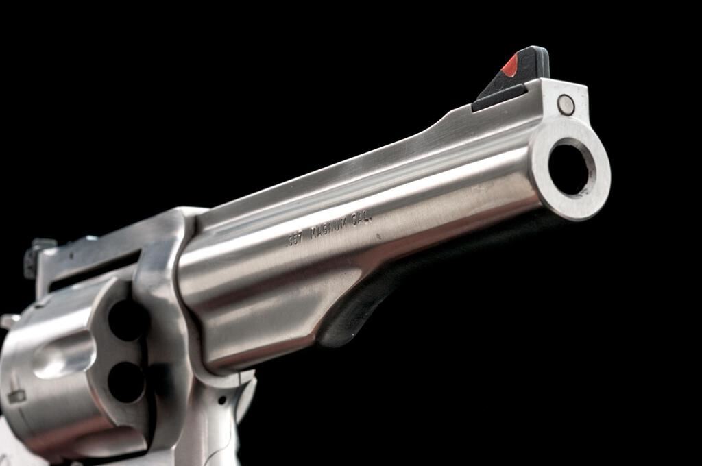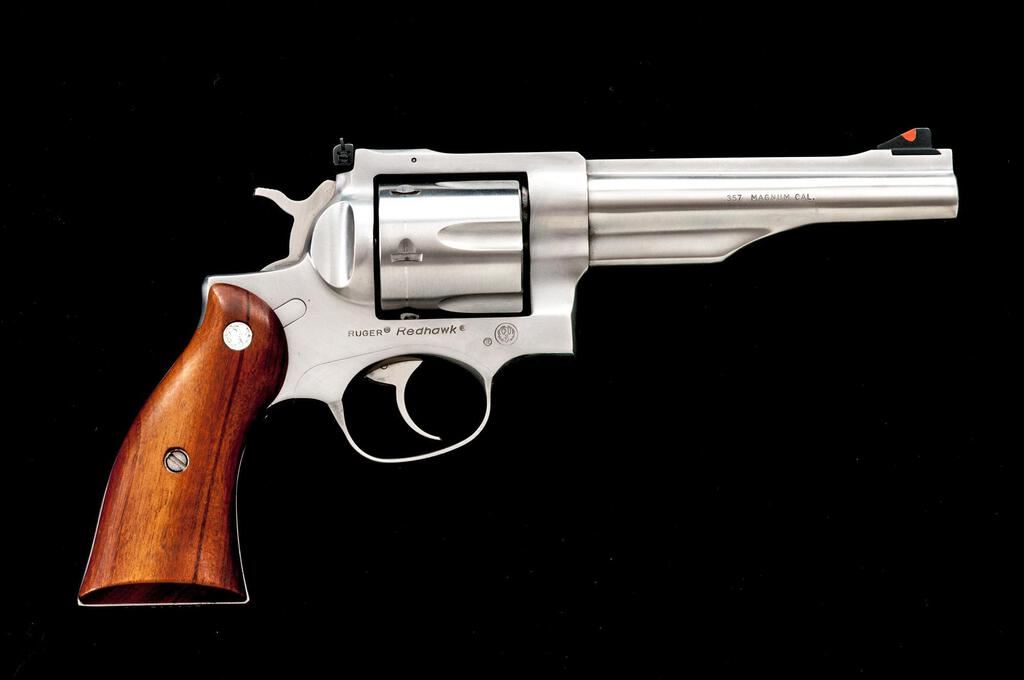 Ruger Redhawk Double Action Revolver, #501-45102, .357 Magnum cal., 5.5" ribbed barrel, orange insert ramped blade and square-notched adjustable rear sights, smooth wood Ruger two-piece medallion grips, in all stainless steel construction. Mfg'd 1985. Revolver is in near excellent overall condition, with scattered handling marks and a light index line on the cylinder. Smooth wood grips are near excellent with small mars and storage marks. Action is crisp, bore is very good. Est.: $750-$1,000. (Modern/PPT)