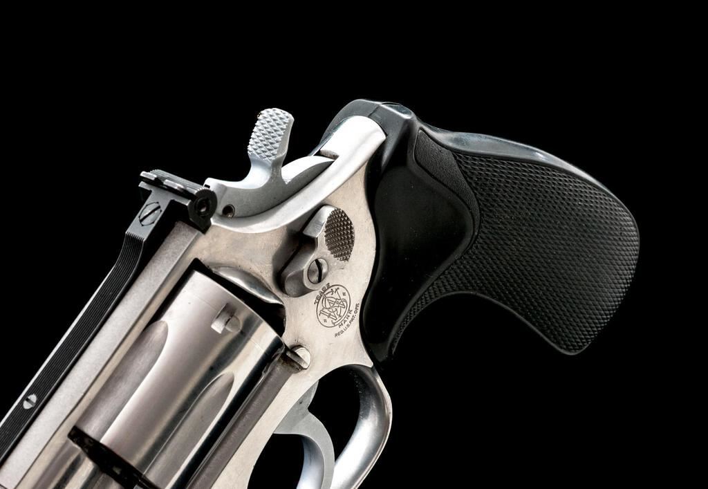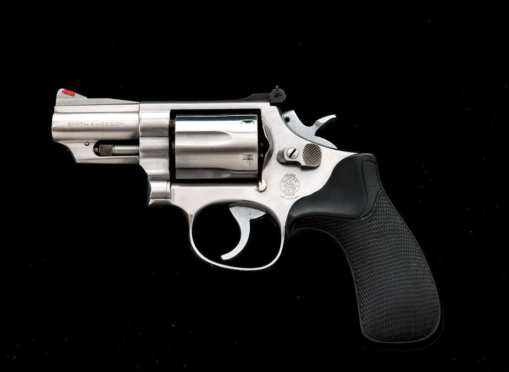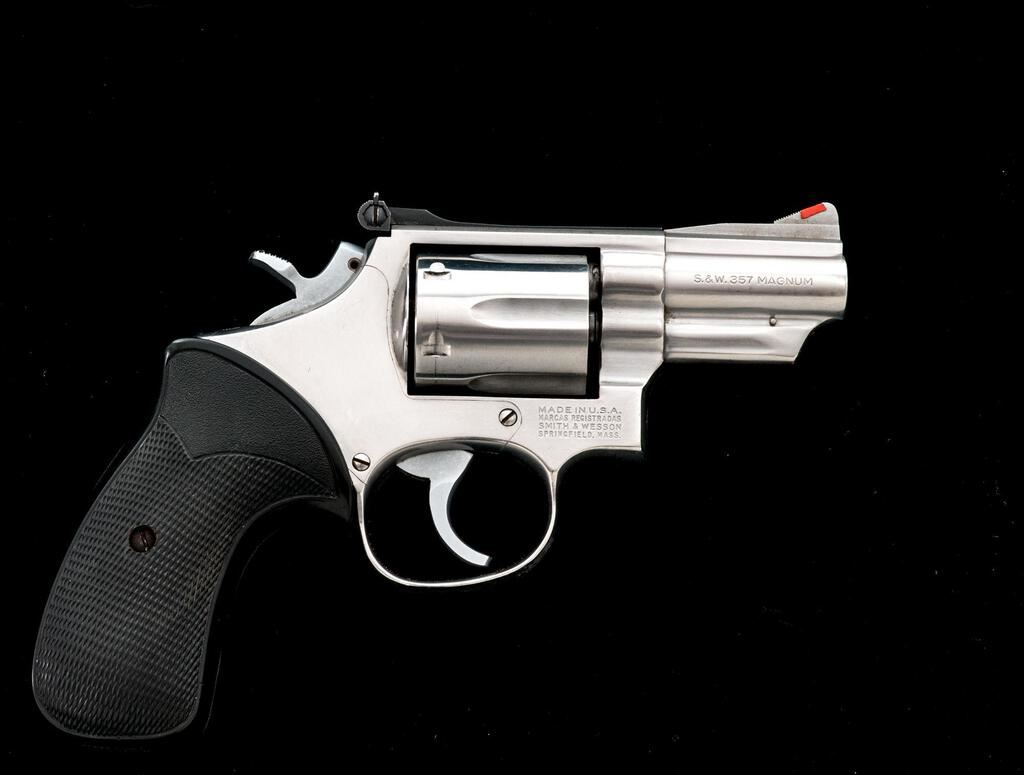 Smith & Wesson Model 66-2 Combat Magnum Double Action Revolver, #216K469, .357 Mag. cal., 2.5" barrel, orange insert ramped blade front and adjustable rear sights, stainless steel, checkered rubber one-piece Pachmayr Presentation/Compac grips, with 6-shot cylinder. This model was discontinued in 2004. Revolver is in near excellent overall condition, with intermittent light scratches, an index line, and holster wear at the muzzle. Grips are very good and fit well. Bore is very good with clearly defined rifling, and the action is crisp on this lightly used S&W. Est.: $800-$1,000. (Modern/PPT)