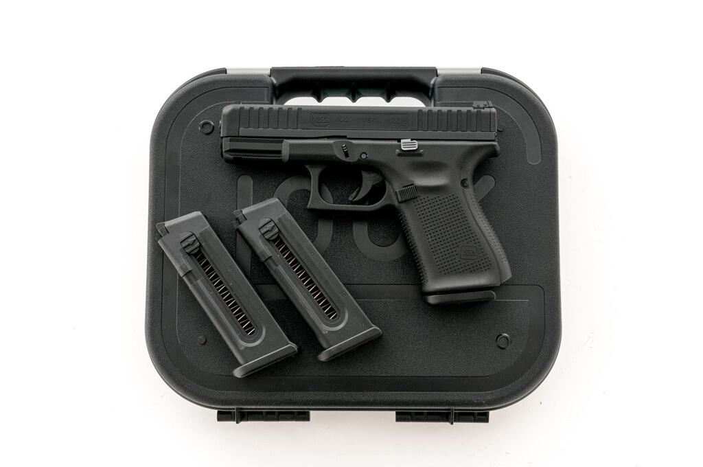 Like New Glock Model 44 Gen 5 Semi-Automatic Pistol, #ADPU062, .22 LR cal., 4" barrel, lightweight polymer covered steel slide, black polymer frame with integral lower accessory rail, white dot front sight and square-notched white outline rear sight, with three (3) 10-rd. Glock magazines. In matching numbered Glock case with sealed instruction manual and four (4) additional interchangeable back straps. Pistol is in like new condition, appearing to have been handled and fired very little. Bore is mirror bright. Est.: $300-$400. (Modern) (Not available to Calif. residents.)