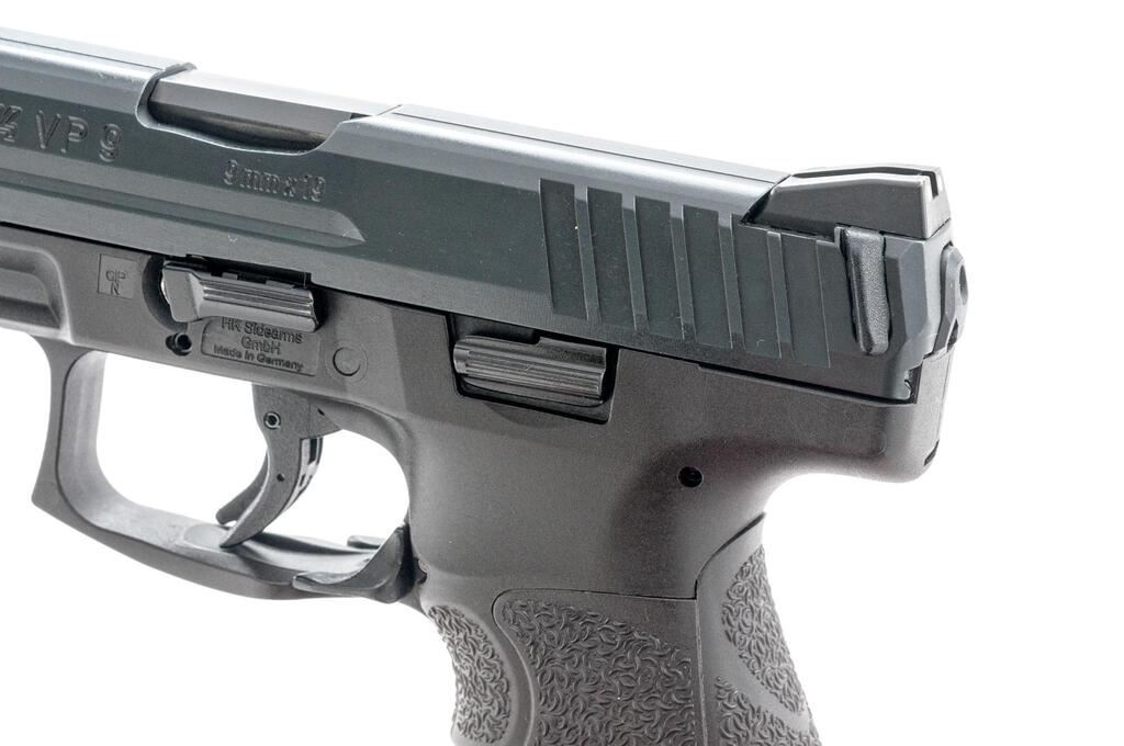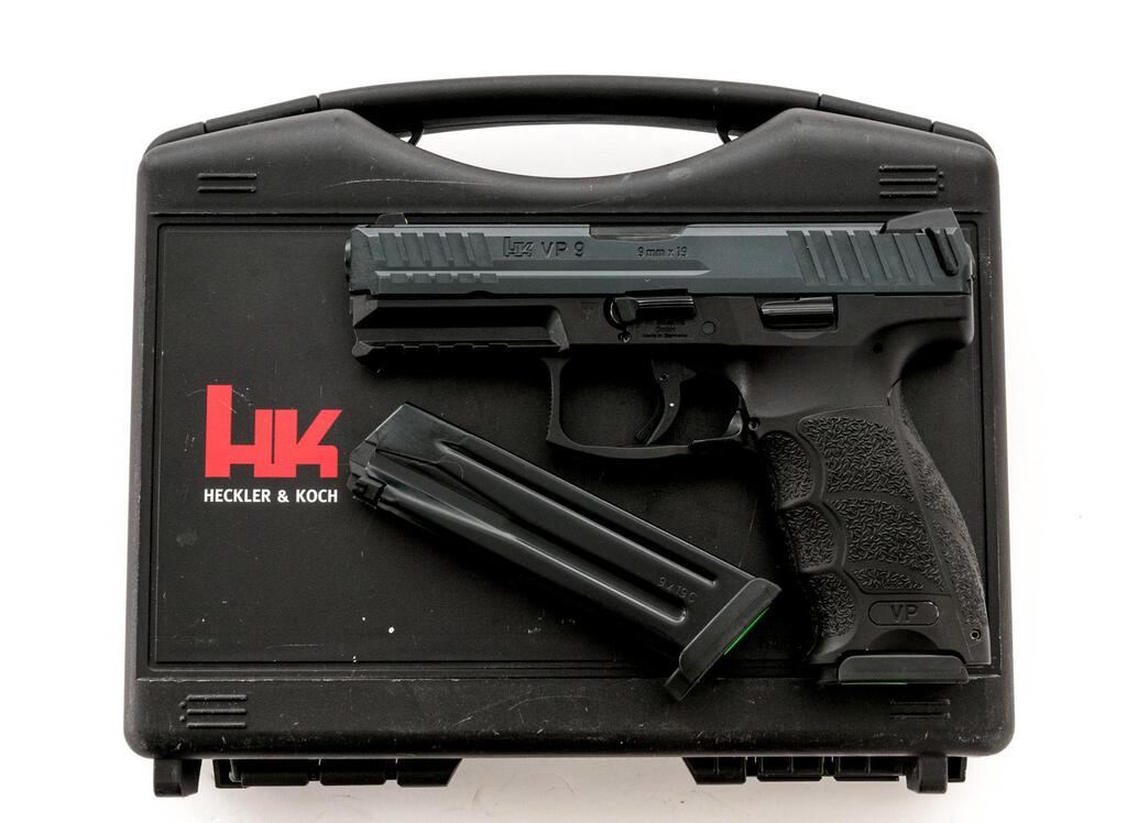 Heckler & Koch Model VP9 Semi-Automatic Pistol, #224-109864, 9mm, 4" barrel with fixed three-dot luminous sights, black finish, ergonomic grips with changeable back straps, side panels and molded finger grooves, one 15-rd. and one 17-rd. hi-cap magazine, factory plastic hard case with interchangeable grip parts (2 back straps and 4 side panels) and associated packaging materials. Pistol is in excellent overall condition retaining approx. 98%-99% factory finish, with only light handling marks. Grips are excellent showing little use. Action is crisp, bore is very good. Est.: $600-$800. (Modern)(Not available to Calif. residents.)