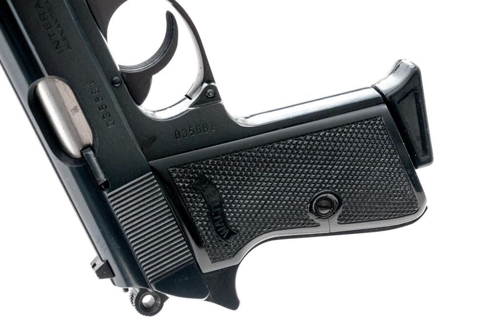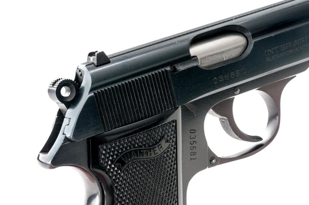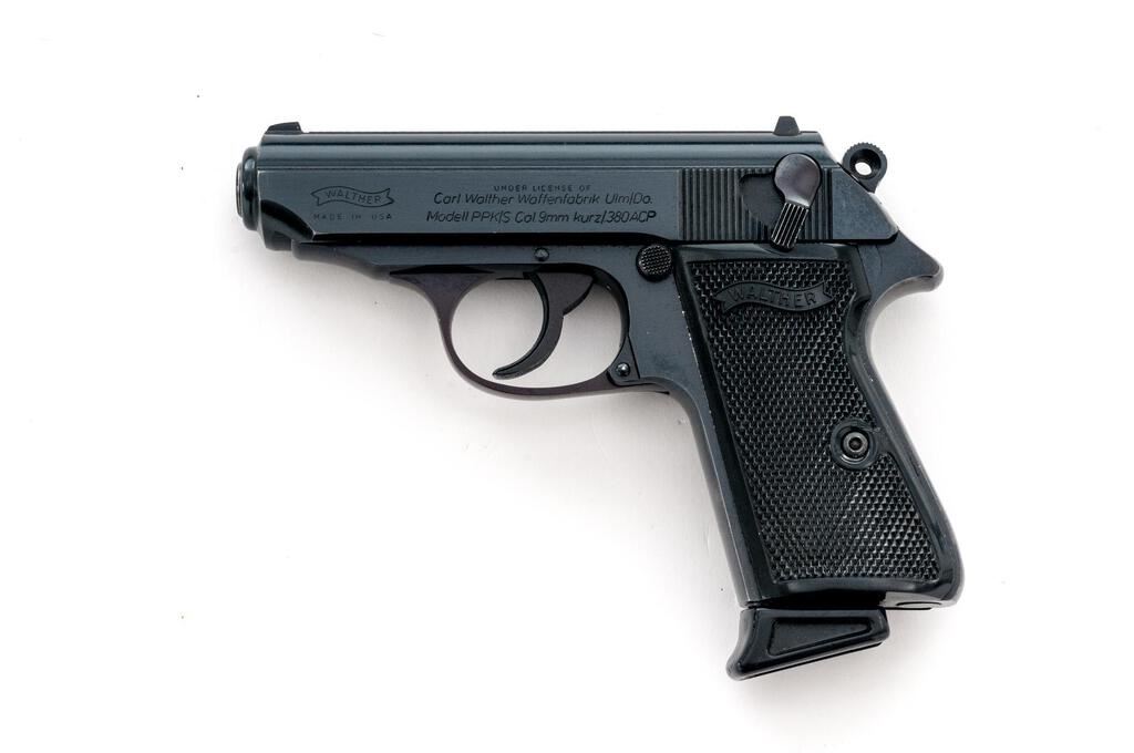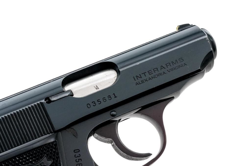 Walther Model PPK/S Semi-Automatic Pistol, #035681, .380 ACP cal., 3.25" barrel, blue finish, original checkered black plastic Walther grips, white-dot blade front and square-notched rear sight. Includes two (2) 7-rd. Walther magazines, one with black plastic finger extension and (1) one Mec-Gar 7-rd magazine. In original matching numbered black plastic Walther case with instruction manual and matching numbered test target. Right side of slide is marked "Interarms/Alexandria, Virginia". Made in U.S.A. Test target is dated 3/83. Pistol is in near excellent condition retaining approx. 98%+ factory blue with only a few slight handling marks. Grip checkering is sharp. Action operates smoothly, bore is bright with strong rifling. Est.: $600-$800. (Modern/PPT)