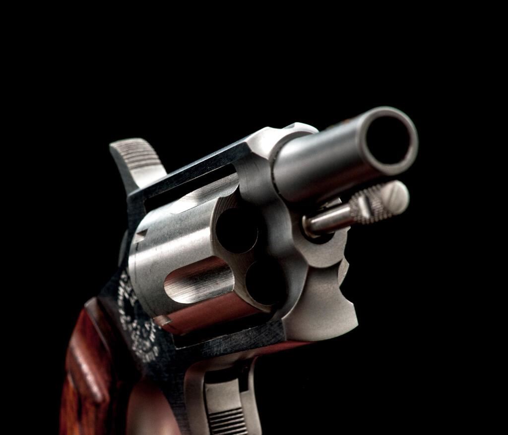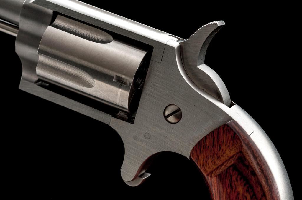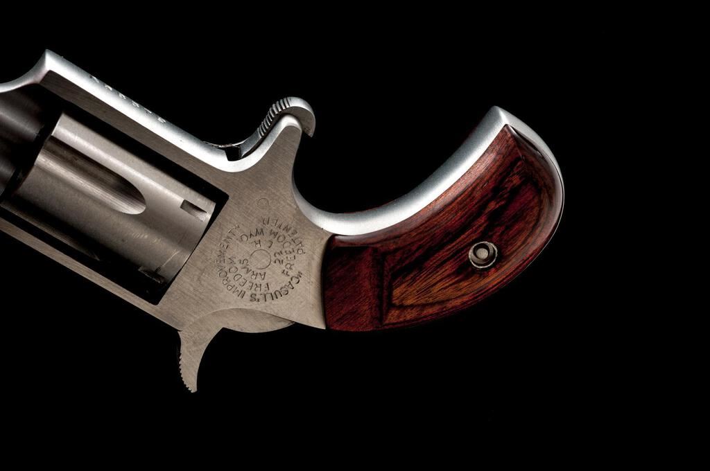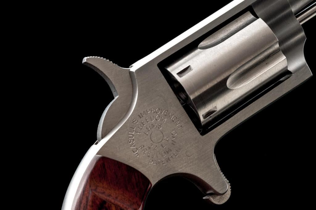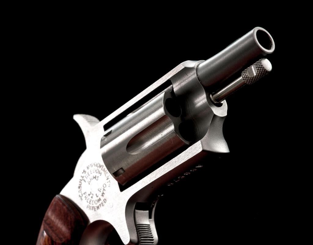Freedom Arms Mini Single Action 5-Shot Revolver, #A68579, .22 LR cal., 1" barrel with a missing blade front and fixed rear sights, brushed stainless steel finish, 5-shot fluted cylinder, smooth two-piece laminate wood bird's head grips, spur trigger. Pistol is in near excellent overall condition showing little use, with the front sight having been removed and left vacant. There is light surface rust where the sight was removed, otherwise the revolver shows only light handling marks. Right side of frame is marked "CASULL'S IMPROVEMENT/FREEDOM ARMS". Bird's head grips are excellent and fit well. Bore is good and action is crisp. Est.: $200-$400. (Modern/PPT)