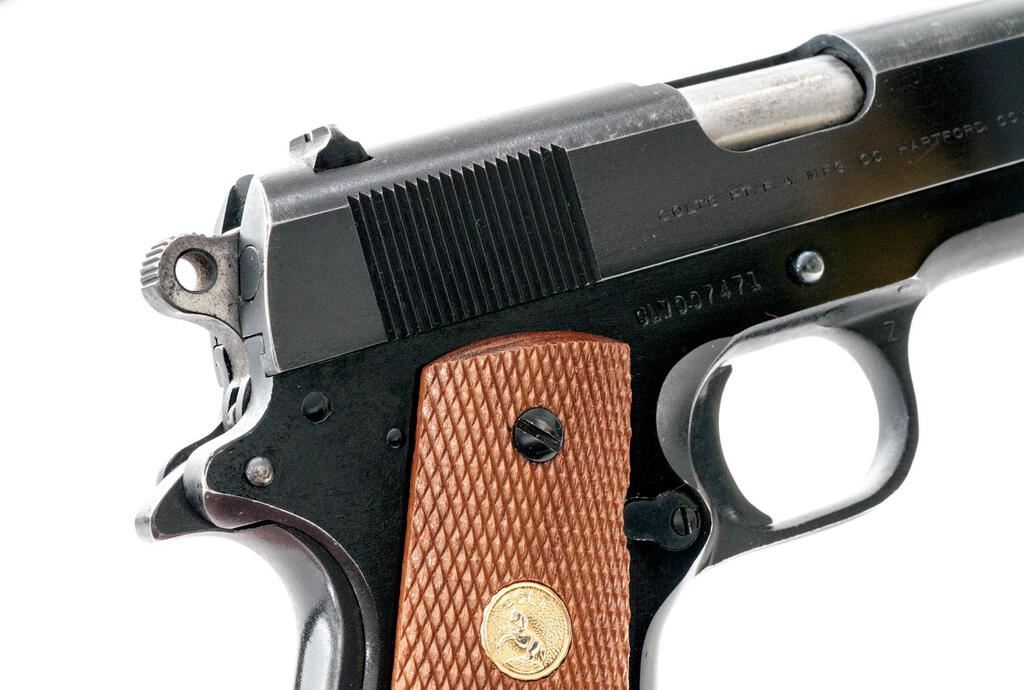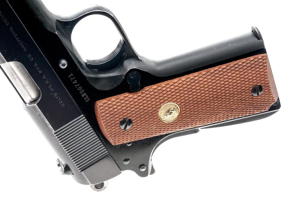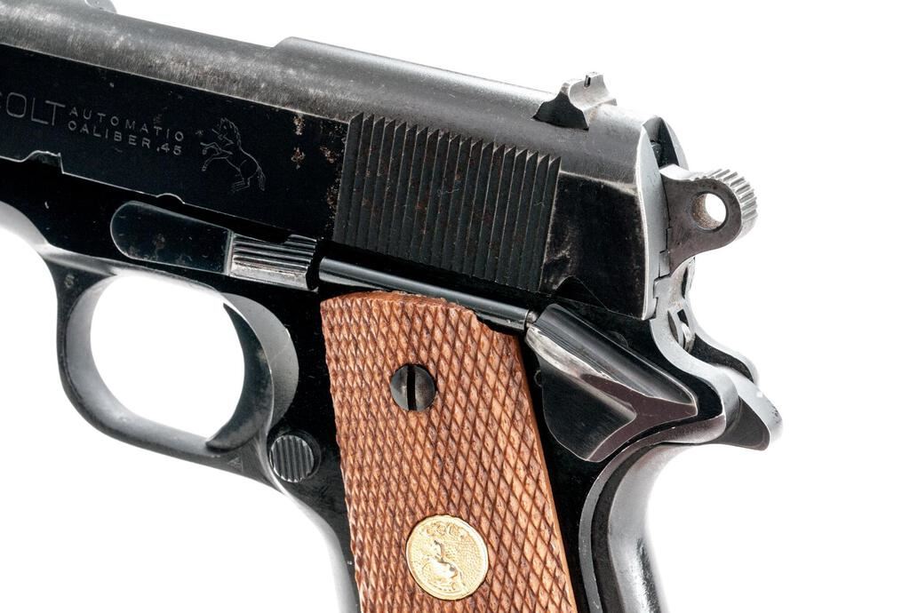 Colt Series 70 1911 Lightweight Commander Semi-Automatic Pistol, #CLW007471, .45 ACP cal., 4.25" barrel, blade front and square-notched fixed rear sights, blue finish, checkered walnut two-piece Colt medallion grips, Colt marked 7-rd. magazine, and ringed hammer. Mfg'd 1970. Pistol is in very good overall condition retaining approx. 90% factory blue finish, with holster wear at the muzzle and along the length of the slide. There are numerous light scratches, mars, thinning of finish, and light surface erosion on the left side of the slide at the rear; mainspring housing is worn. Grips are very good with sharp checkering. Action works well, bore is good. Est.: $800-$1,000. (C&R/PPT)