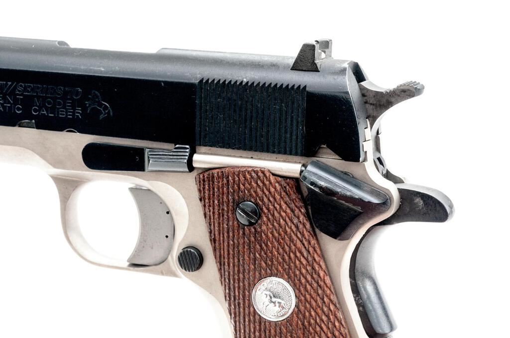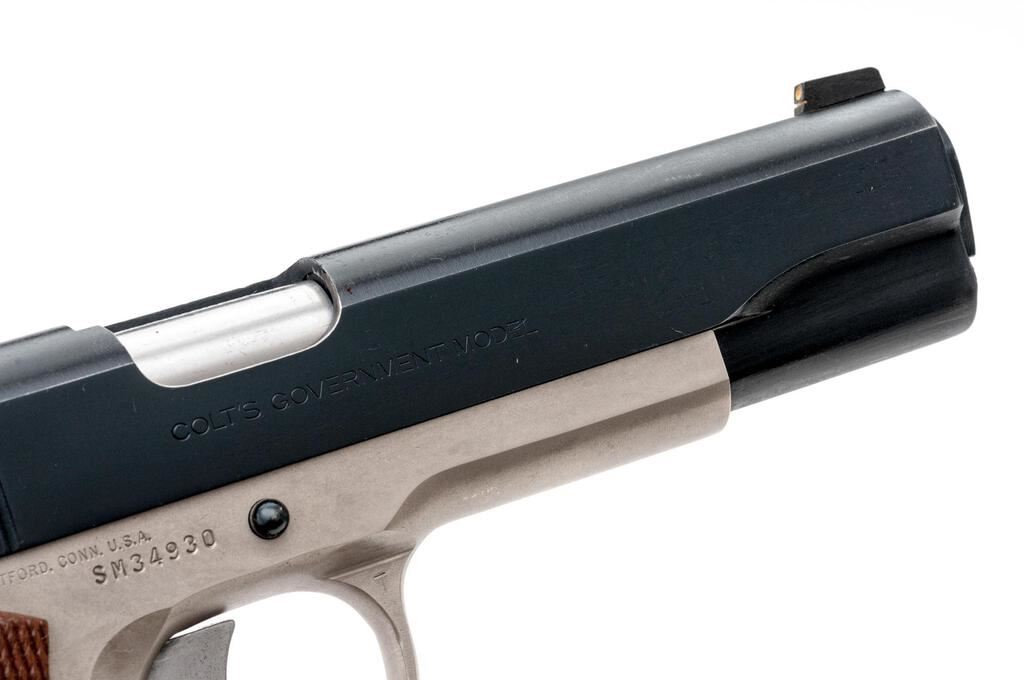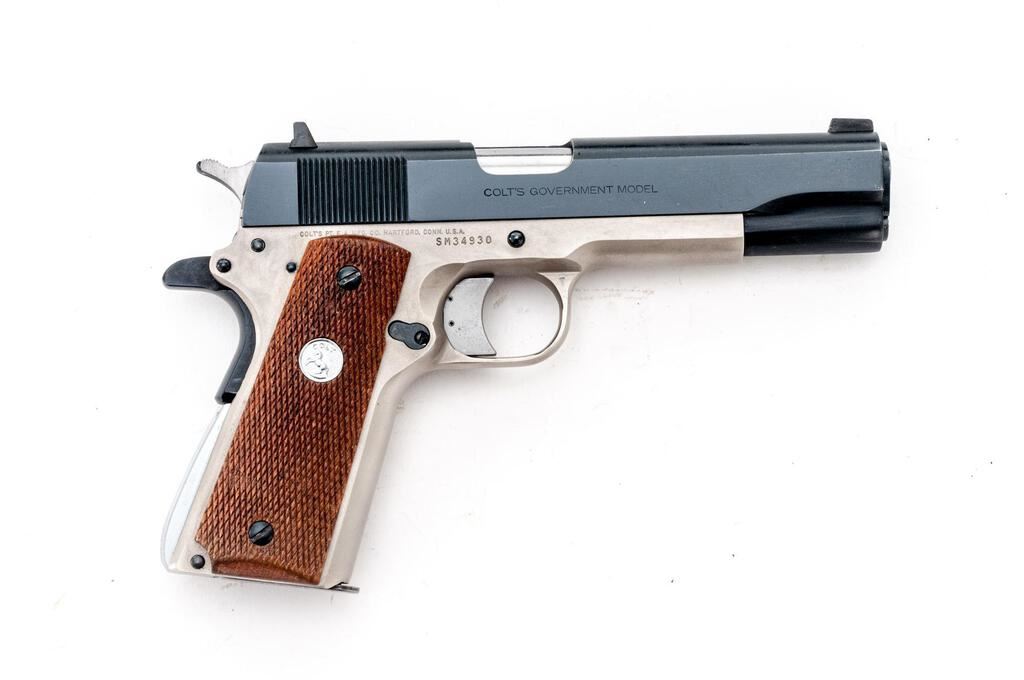 Composite Post-War Colt Ace Semi-Automatic Pistol, #SM34930, consisting of a electroless nickel Service Model Ace frame and blued MK IV Series 70 slide, .45 ACP cal., 5" Series 70 barrel, blued small parts, checkered walnut grips with silver Colt medallions, white-dot blade front sight and square-notched rear sight, with one blued steel Colt magazine. Mfg'd 1981. Condition is very good retaining approx. 97% factory blue, with a few light scratches and spots of edgewear. Frame shows light handling wear that is associated with moderate range use. Factory lettering is clear. Grips show general handling wear and grip checkering is generally dull, medallions are bright. Action operates smoothly. Bore is bright, rifling shows moderate wear but is still clearly defined. Est.: $1,200-$1,800. (Modern/PPT)