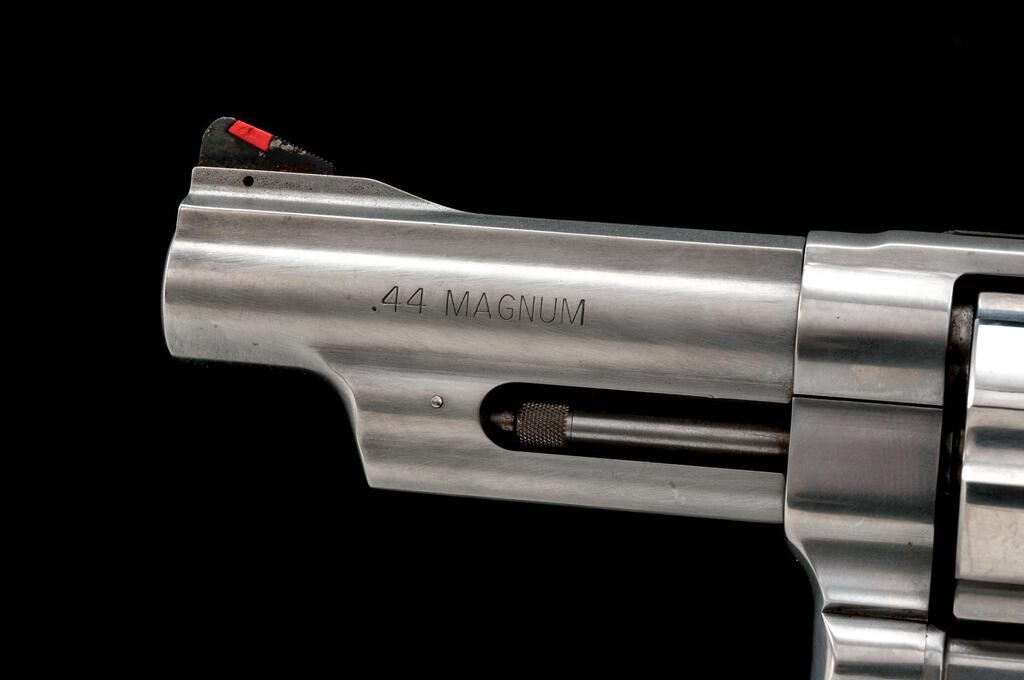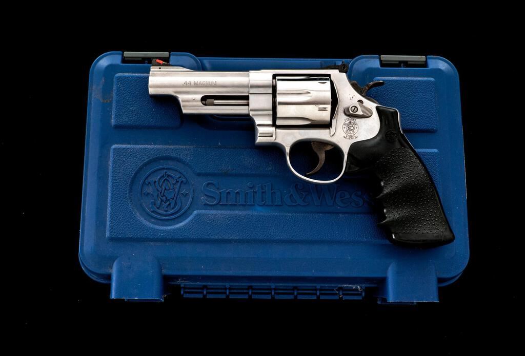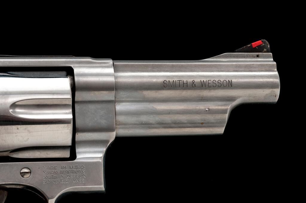 Smith & Wesson Model 629-6 Double Action Revolver, #CNS0941, .44 Magnum cal., 4" barrel, red insert ramped blade front and adjustable rear sights, 6-shot cylinder, brushed stainless steel finish, S&W textured rubber one-piece combat grips. Includes the factory blue plastic case with a matching end label. Revolver is in very good overall condition with light scratches and mars from carry and use. There is light surface rust around the base of the front sight and some dried oil that should clean. Hammer and trigger show muted color case hardening. Grips are very good and show little use. Action locks up tight, bore is very good with crisp rifling. Est.: $700-$900. (Modern/PPT)