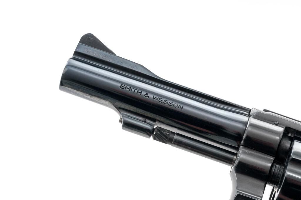 Smith & Wesson Model 15-3 Double Action Revolver, #5K45580, .38 Spec. cal., 4" pinned barrel, serrated ramped blade front and adjustable rear sights, 6-shot cylinder, K-frame, blue finish, checkered rubber one-piece Pachmayr combat grips. Mfg'd 1973. Revolver is in near excellent overall condition retaining approx. 94%-96% polished blue finish, with light handling marks and a faint index line on the cylinder. Hammer and trigger show muted case colors. Combat grips are replacements and are in very good condition. Action is crisp and the timing is excellent; bore is very good. Est.: $500-$700. (Modern/PPT)