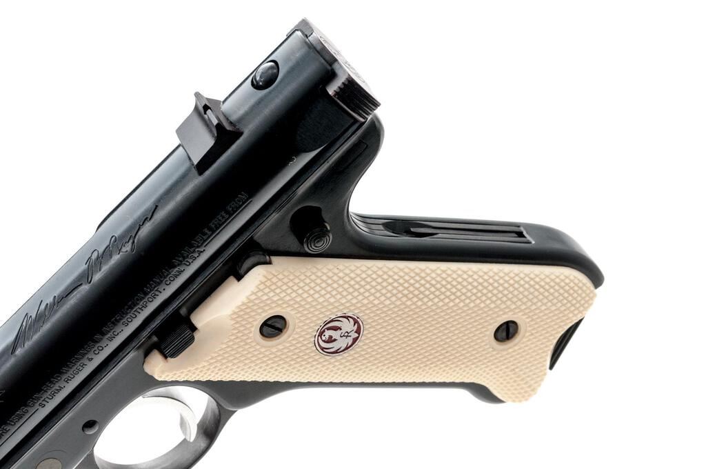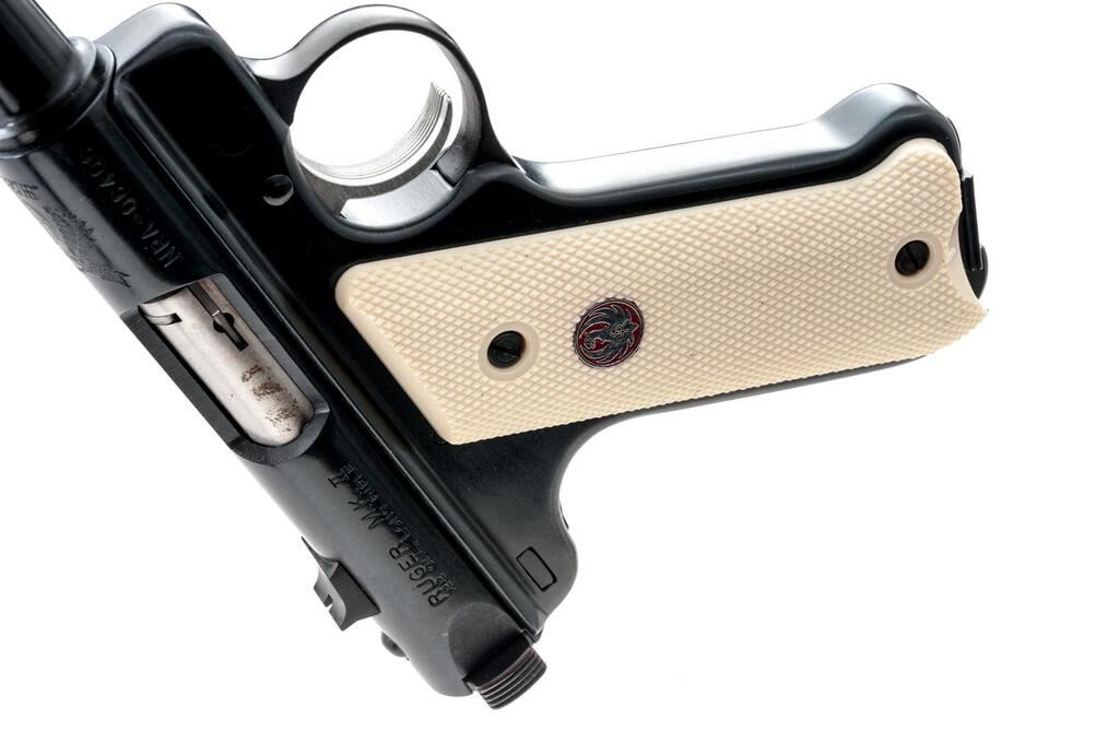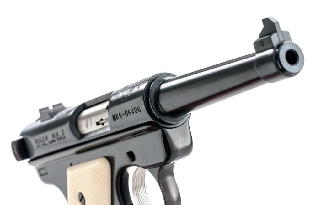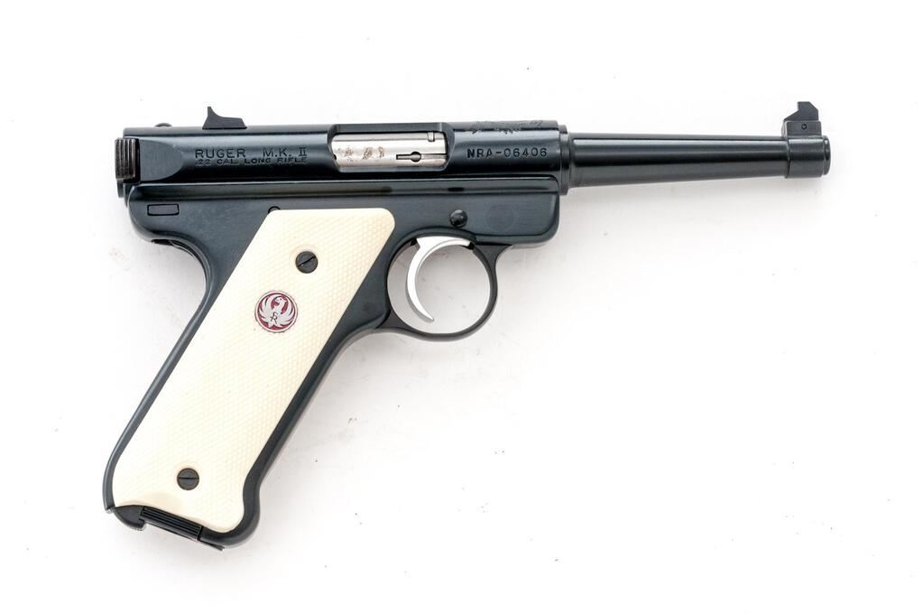 Ruger MK II NRA William B. Ruger Endowment Semi-Automatic Pistol, #NRA-06406, .22 LR cal., 4.75" tapered barrel, Patridge front and square-notched fixed rear sights, blue finish, ivory plastic checkered two-piece medallion grips, and 10-rd. Ruger marked magazine. Includes the red plastic factory hard case, manual, endowment literature, spent case, and an extra magazine. Mfg'd 2003. Pistol is as new retaining approx. 99% factory blue finish with only light handling marks. There is a crisp Ruger crest and NRA on the receiver along with William B. Ruger's signature. Grips feature a red Ruger logo and are in excellent condition. Action is crisp, bore is excellent. Est.: $500-$700. (Modern/PPT)