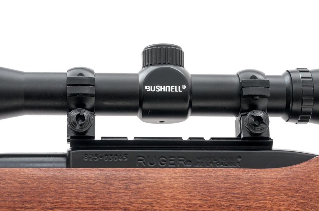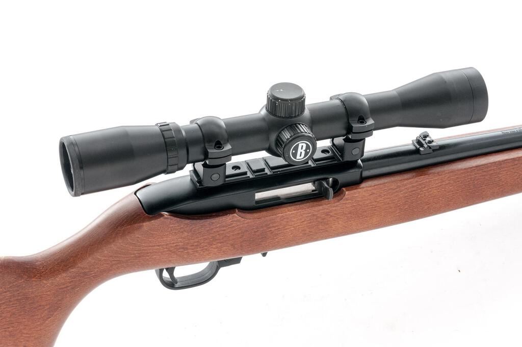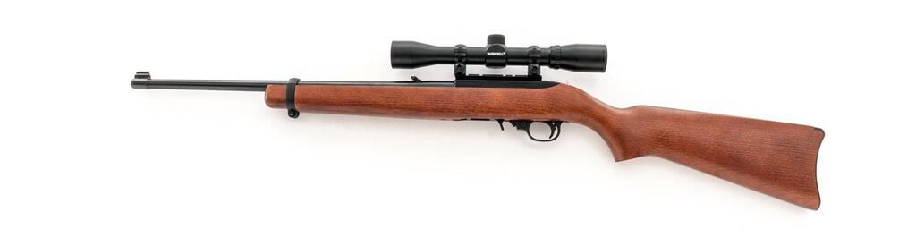 Ruger 10-22 Semi-Automatic Carbine, #825-03045, .22 LR cal., 18.5" barrel, brass bead on a banded blade front and folding rear sights, blue barrel with a flat black-finished receiver, smooth wood one-piece pistol grip stock, with a plastic crescent buttplate and 10-rd. Ruger marked rotary magazine. Topped with a one-piece Weaver style base, rings, and a Bushnell fixed 4x rifle scope in matte black with a duplex reticle and sunshades; scope shows crisp optics. Rifle is in near new condition with only light handling marks. Stock is excellent showing little use. Action is crisp, bore is very good. Est.: $200-$400. (Modern)