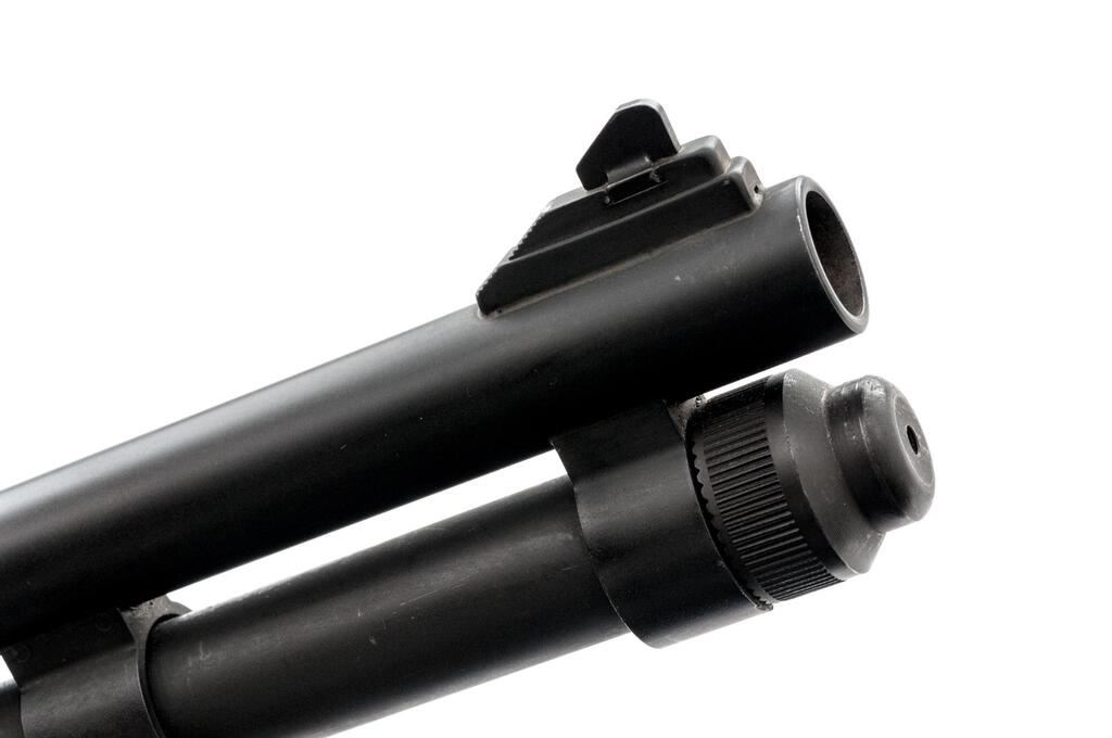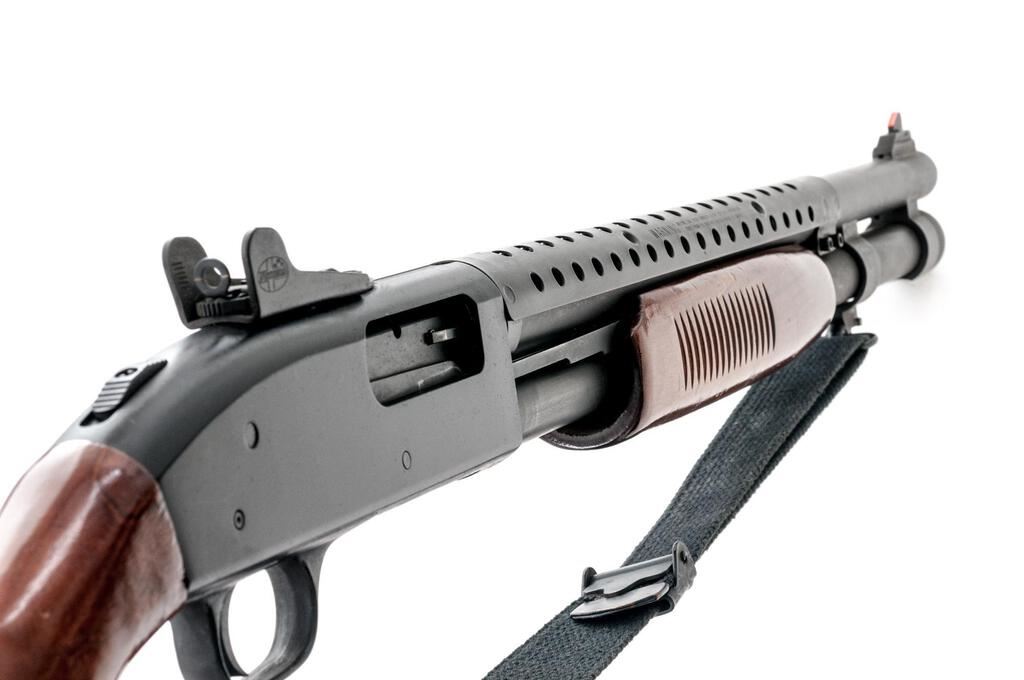 Mossberg Model 590A1 Pump-Action Shotgun, #T491016, 12 ga., 20-7/8" parkerized barrel, cylinder bore, matte finish, hardwood stock and forend, front/rear sling swivels, tactical rear sight and raised front blade that has been painted orange, extended magazine tube. Metal surfaces are in near excellent condition with only minor scuffs and handling marks. A ventilated handguard has been added to the barrel. Wood is in very good condition with both stock and forend showing light scratches and dents, the most visible scratch being approx. 1.25" long located on left side of stock. The numbers "016" are stamped on top rear of comb. A red Mossberg ventilated recoil pad brings the LOP to 14" and the OAL of the shotgun is 40.25". Action is smooth and locks up tight, bore is bright. Includes black cotton sling. Est.: $600-$800. (Modern)