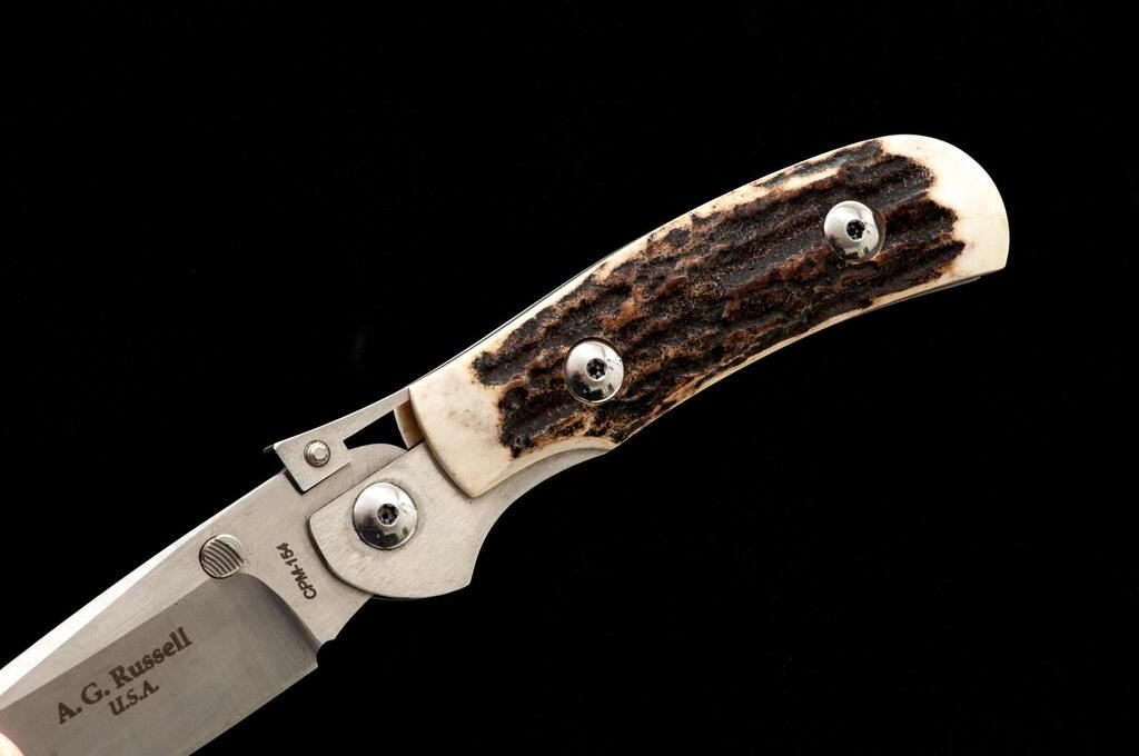 Lot of Two (2) Knives, by A.G. Russell: 1.) Shop-made Fixed Blade Knife, 4-7/8" satin-finished blade, 9-1/2" overall, double stainless hilt, black micarta handle with red spacers, and brown leather sheath. Knife and sheath are in excellent condition. There is a small line of mild surface rust on one side, where the blade meets the hilt, otherwise appearing like new. 2.) One Handed Folding Knife, 3-1/4" satin-finished drop-point blade, 4" OAC, stag handles. Knife is in excellent, as new condition, with only a few very minor handling marks. Est.: $300-$400/Lot.