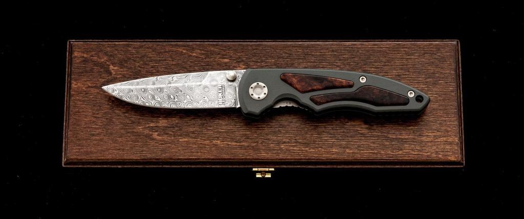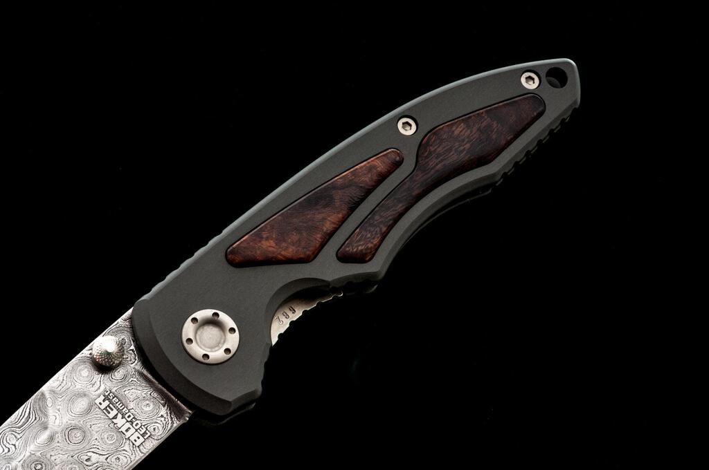 Boker Helios Leo-Damast Linerlock Folding Knife, #682 marked on the liner, 3-3/8" Leo-Damascus pattern blade by Markus Balbach, 4-3/4" OAC, gray aluminum handle with desert ironwood inlays, and pocket clip. Includes the original display box and paperwork. Knife is excellent, appearing as new. Wood box shows a few minor storage type marks. Est.: $250-$400.
