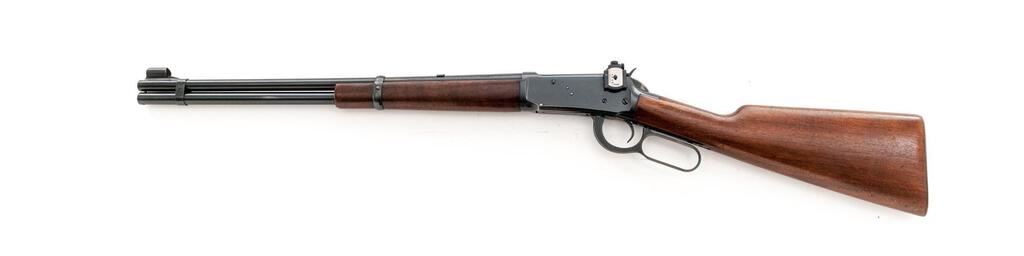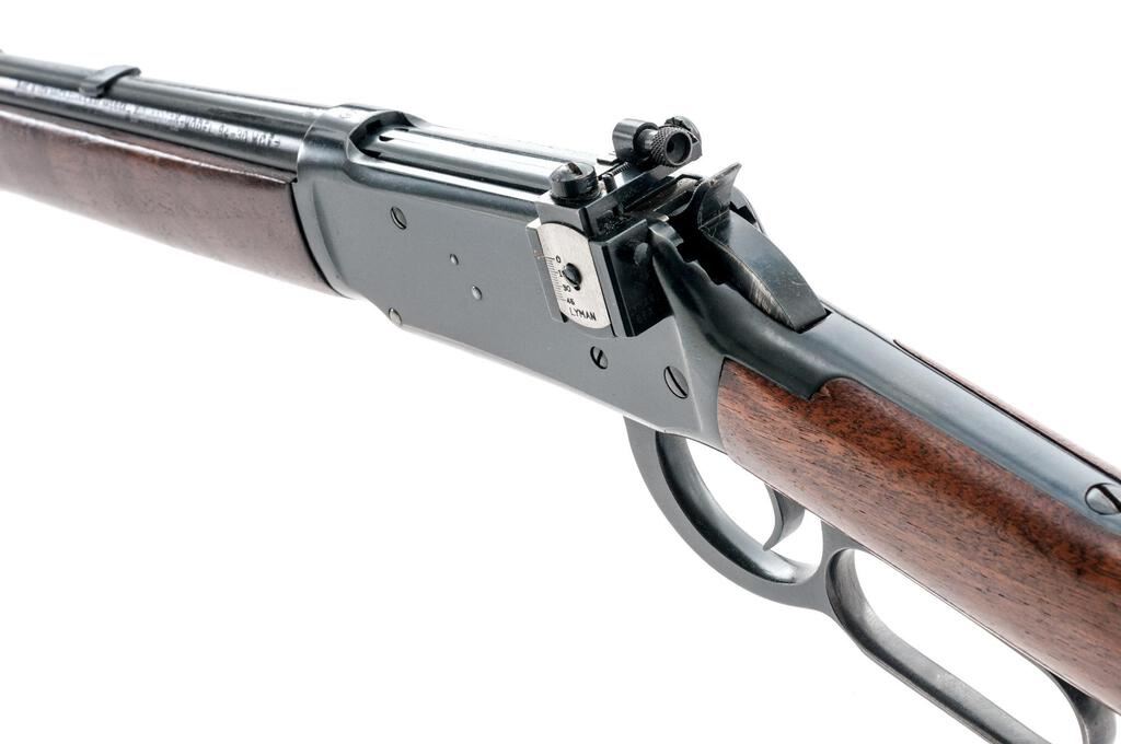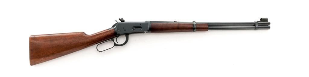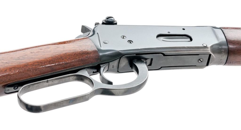 Pre-64 Winchester Model 94 Lever Action Carbine, #1484759, .30-30 CF cal., 20" barrel, ramped/hooded front sight, plugged rear dovetail, full-length mag below; receiver has Lyman windage-elevation adjustable sight; oil-finished stocks with checkered shotgun buttplate. Mfg'd late 1940s. Condition is near excellent retaining approx. 95% original black-blue, highpoint wear at lower receiver, sharp edges and markings. Stocks are sound, smooth with light handling marks. Action is crisp, bore retains sharp rifling. Est.: $700-$1,000. (C&R)
